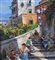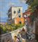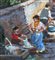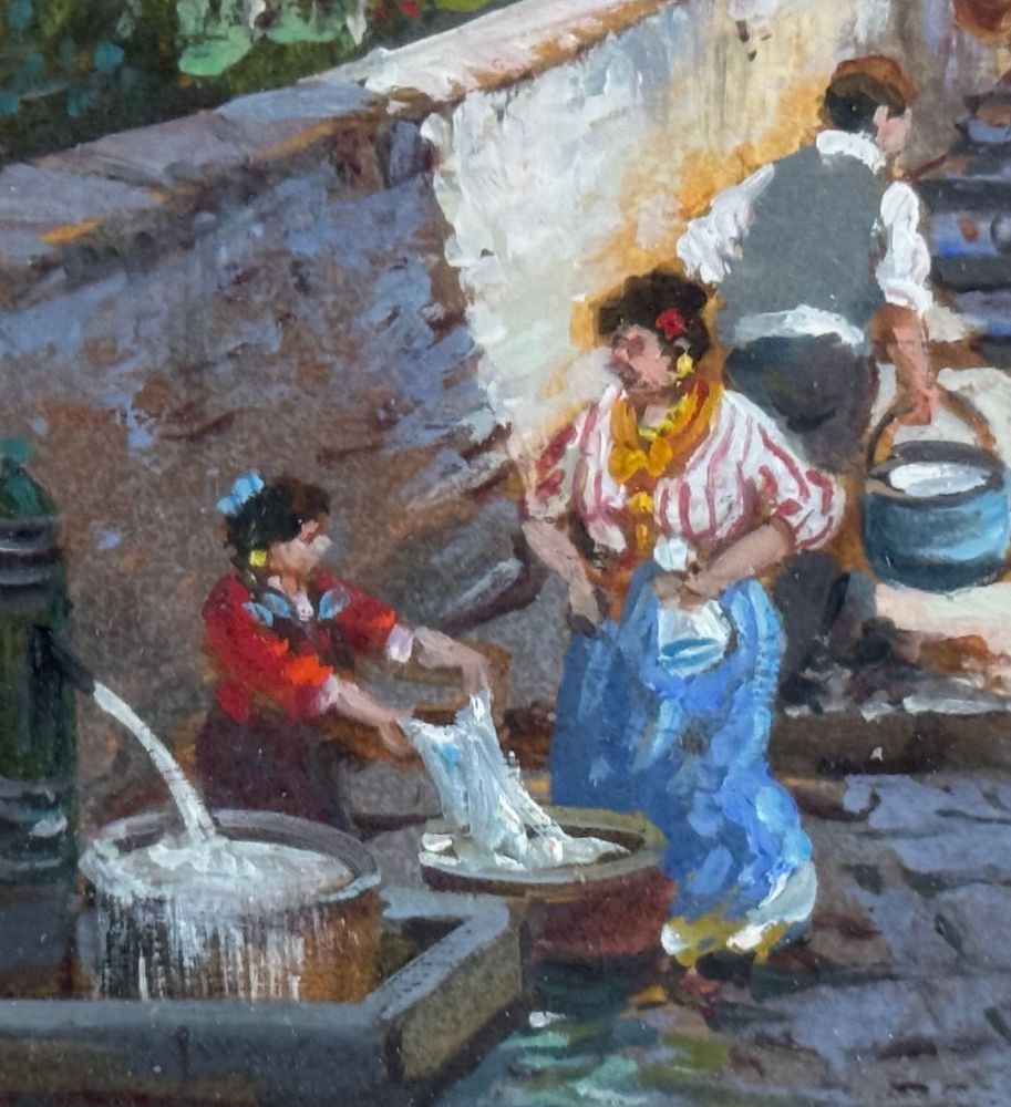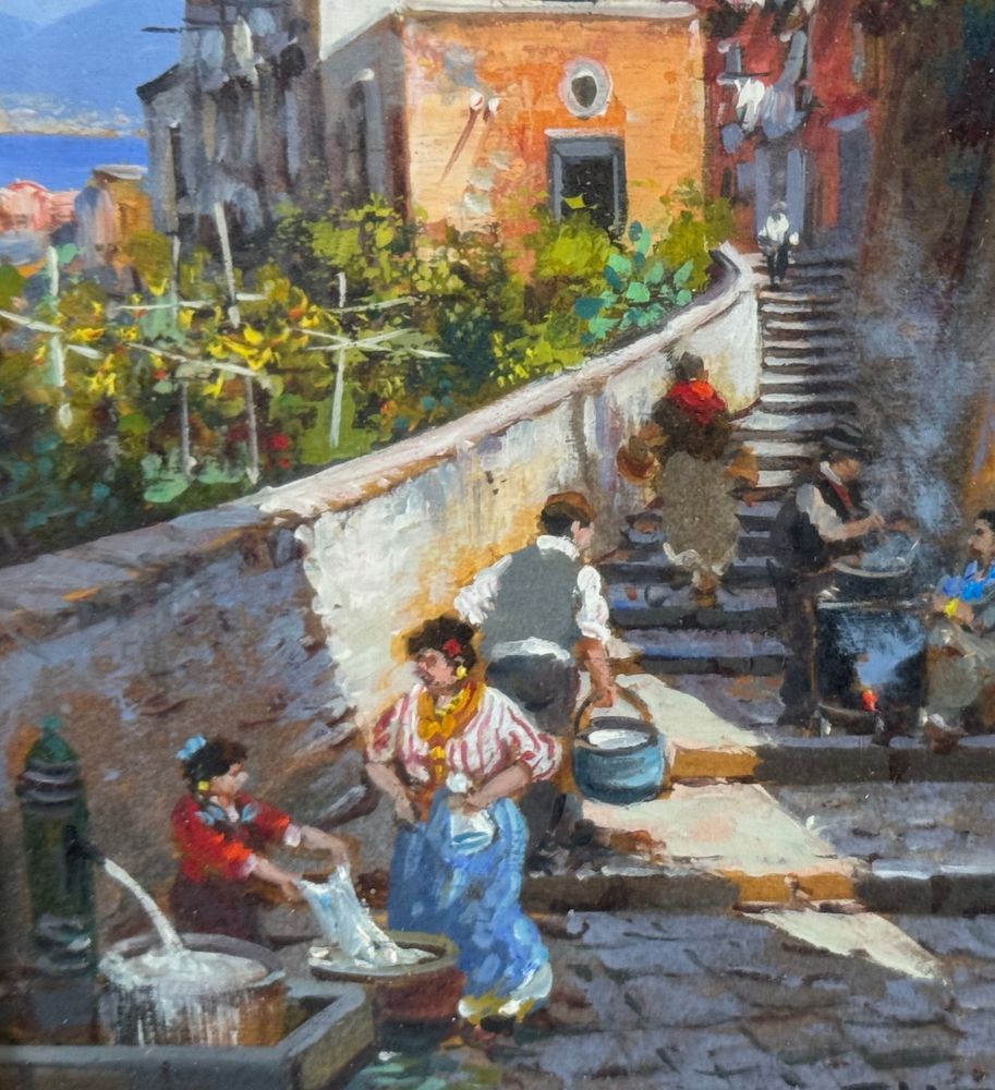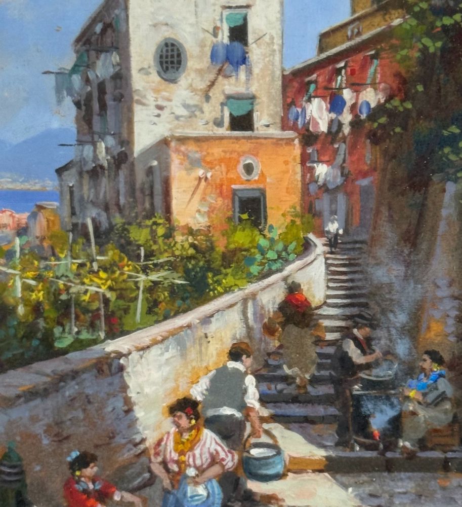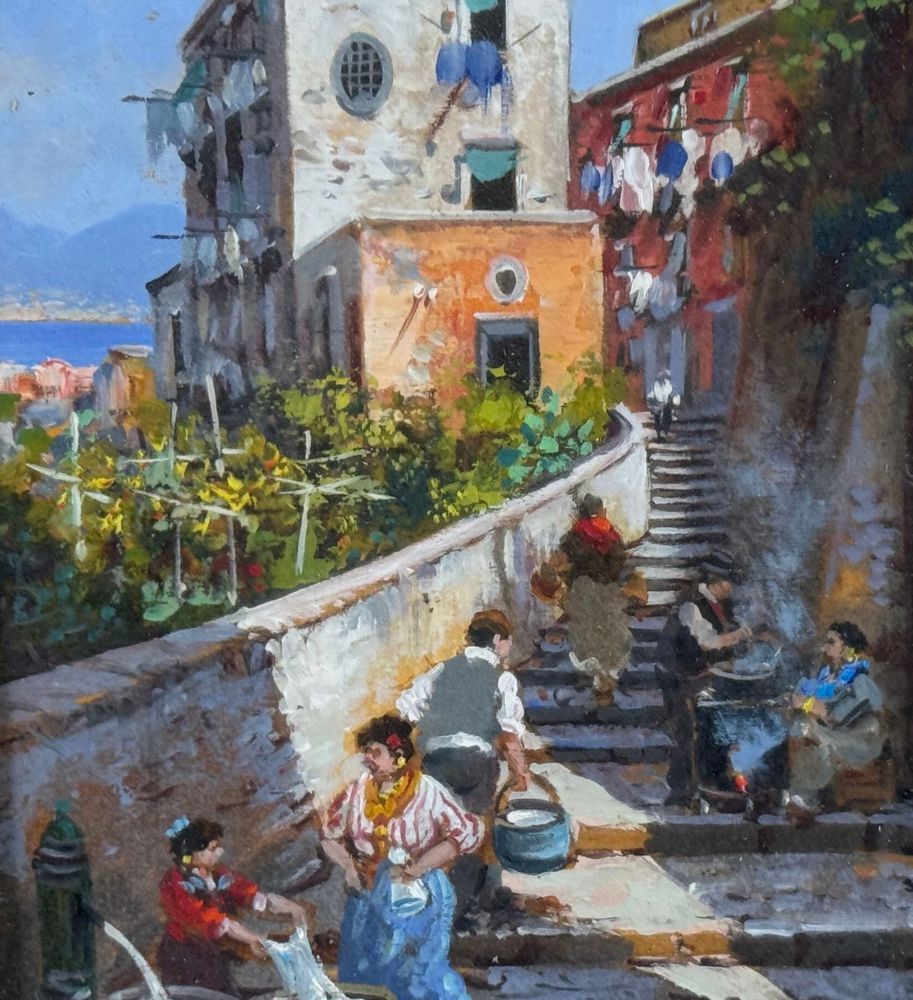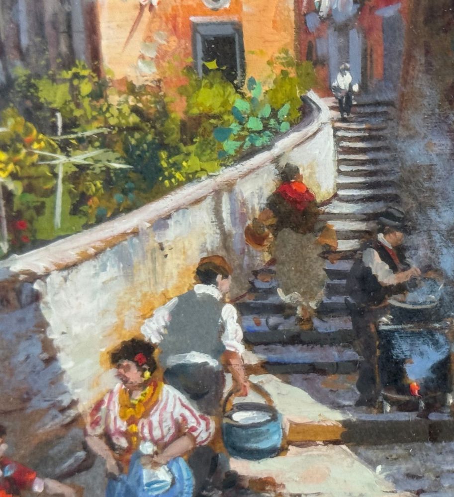 Dipinto olio su tavola, periodo XX secolo, scuola Italiana, raffigurante Stradina con scale e personaggi. Dimensioni compreso cornice: 34x40 cm. Dimensioni interno cornice: 13x18 cm. Firmato in basso a destra e autentica sul retro Vassetti. Opera in buone condizioni.