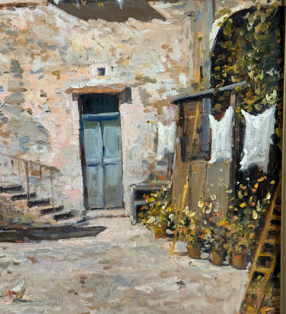 Dipinto olio su tela, periodo XX secolo scuola Italiana, raffigurante Vecchi casale. Dimensioni compreso cornice: 65x85 cm. Dimensioni interno cornice: 50x70 cm. Reca firma in basso a destra da Roberto Cipriano Zuccaro. Opera in buone condizioni.