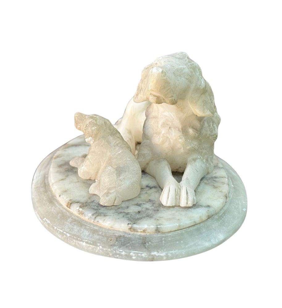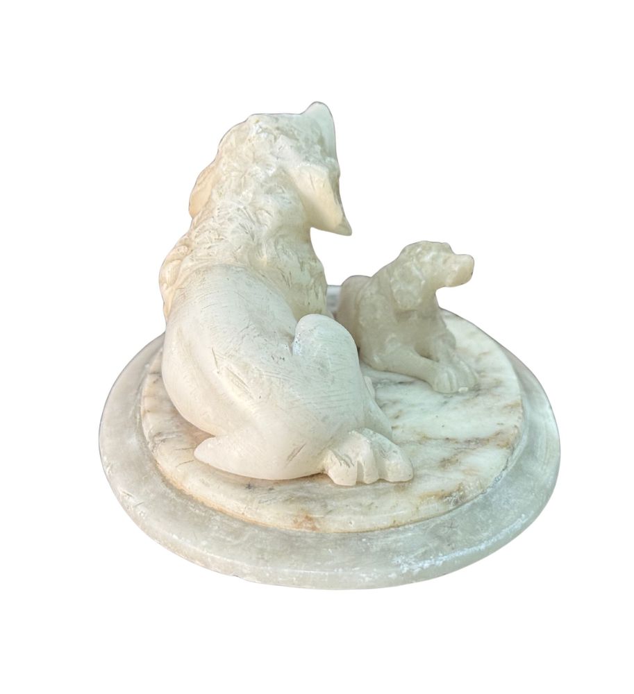 Scultura in marmo bianco, periodo XX secolo, raffigurante Cane con cucciolo. Dimensioni: 13x10x7 cm. Da artista anonimo. Opera in buone condizioni.