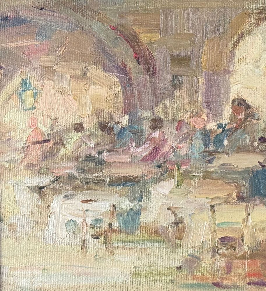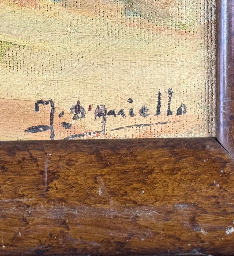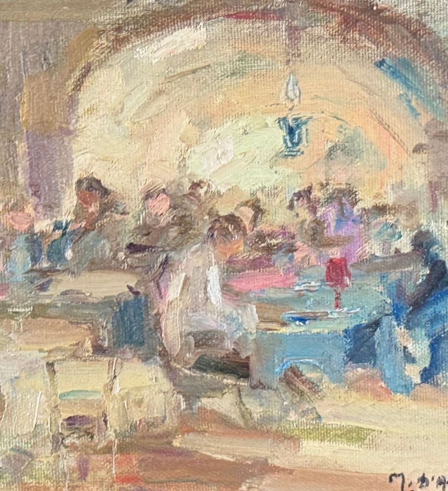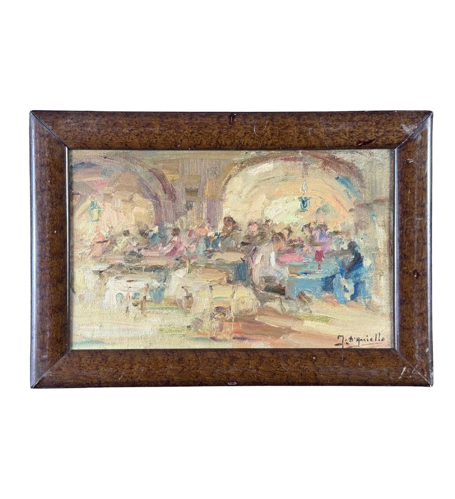 Dipinto olio su tela applicata su pannello, periodo XX secolo, scuola Italiana, raffigurante Personaggi in osteria. Dimensioni compreso cornice: 42x29. Dimensioni interno cornice: 35x22 cm. Firmato in basso a destra M. D'Aniello. Opera in buone condizioni.
