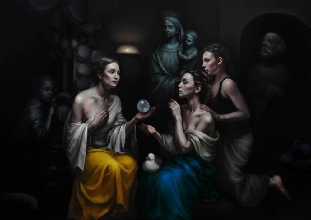 La scena ritrae il momento di un’acquisizione, una scoperta metafisica, compiuta da “patriarche”: donne sapienti. Sullo sfondo, una figura sacra incoronata accorda il proprio beneplacito. Non è soltanto la Madonna dei cattolici: richiama Iside e altre figure femminili sacre dell’antichità — spesso raffigurate con il bambino, o con il serpente sotto i piedi. Precisare questa policromia simbolica evita di confinare l’opera di S. Testa entro un orizzonte esclusivamente confessionale.