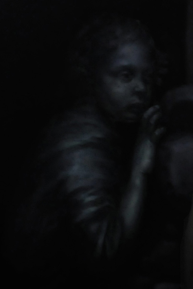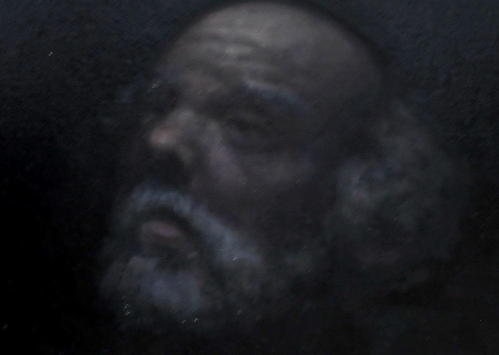 La perla e la sfera alludono alla perfezione e all’infinito: l’unico solido pienamente simmetrico, senza inizio né fine. Sullo sfondo, un vecchio proveniente dal “mondo ordinario”, fatto di buio e inconsapevolezza, si affaccia nella stanza: osserva senza comprendere. Sul lato opposto, un bambino dalle fattezze statuarie spia di nascosto; come il vecchio, non sa ancora ciò che vede, ma avrà una vita intera per elaborare questa esperienza.