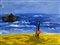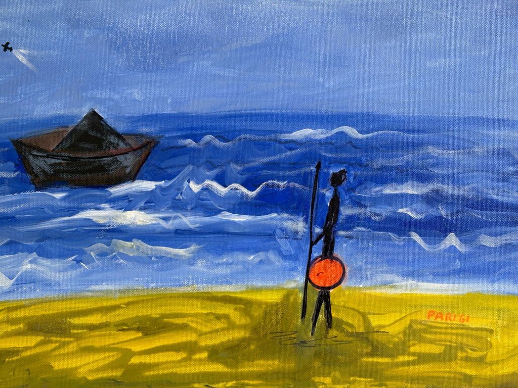 L'uomo di colore (attonito, in attesa e statico nella sua posa di guerriero ) é curioso perché immaginiamo l'ammirazione e lo stupore per l'aereo che sorvola il cielo e per la nave già partita.