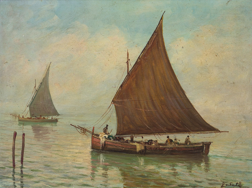 SANTILLI PASQUALE Vele spiegate in lagunaolio su tavola cm. 30x40, firma in...