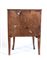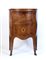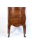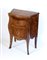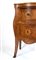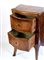 in legno di noce e radica di noce con intarsi in legni di frutto, bombati con due cassetti frontali decorati da raffinati intarsi floreali. Gambe arcuate e terminano con puntali in bronzo cesellato. Forme Luigi XV con influssi neoclassici.