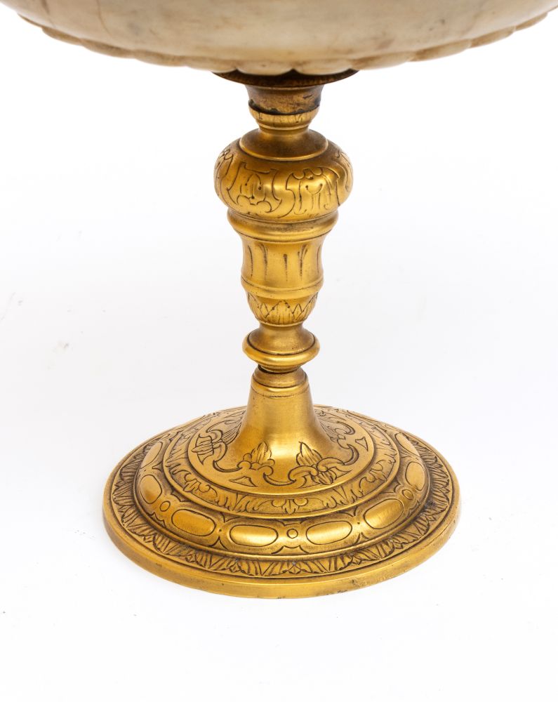 Alzata in bronzo dorato e marmo bianco Italia, XX secolo Altezza x diametro: 18 x 18 cm.