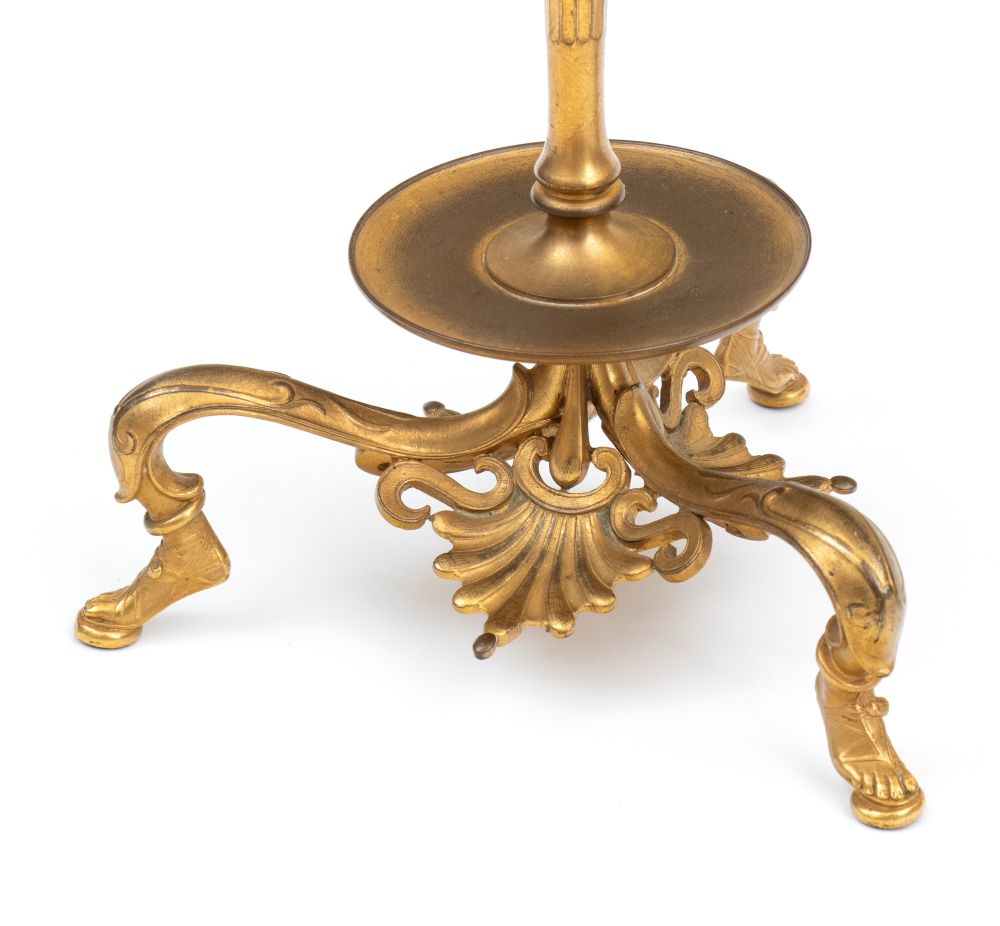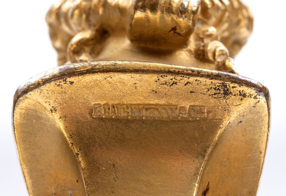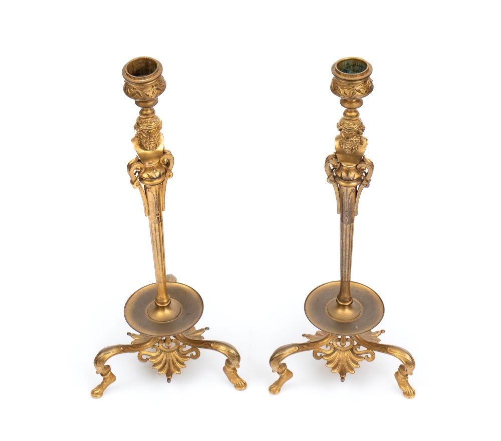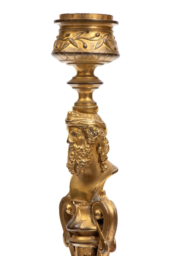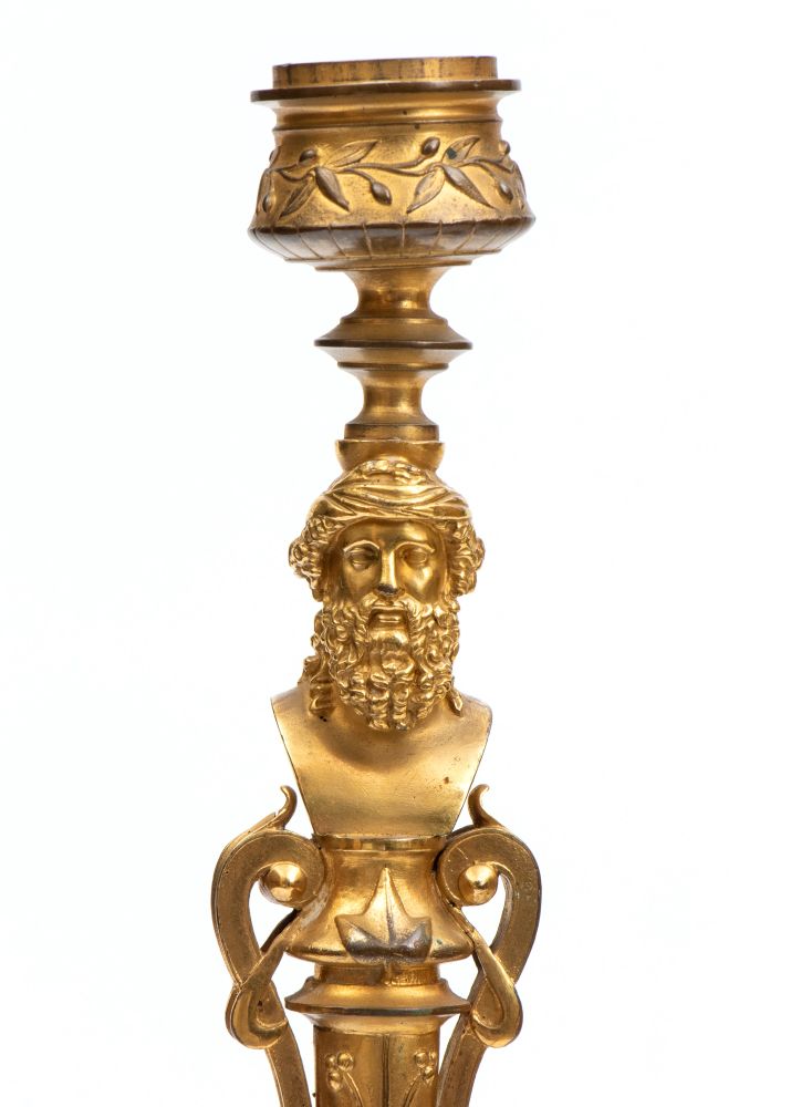 finemente cesellati, base tripode con piedini a piede umano fasciato da calzatura. Fusto slanciato con applicazioni a busto maschile barbuto. Firmati sul retro del busto F. Bardebienne & Cie. (1810-1892)