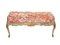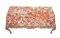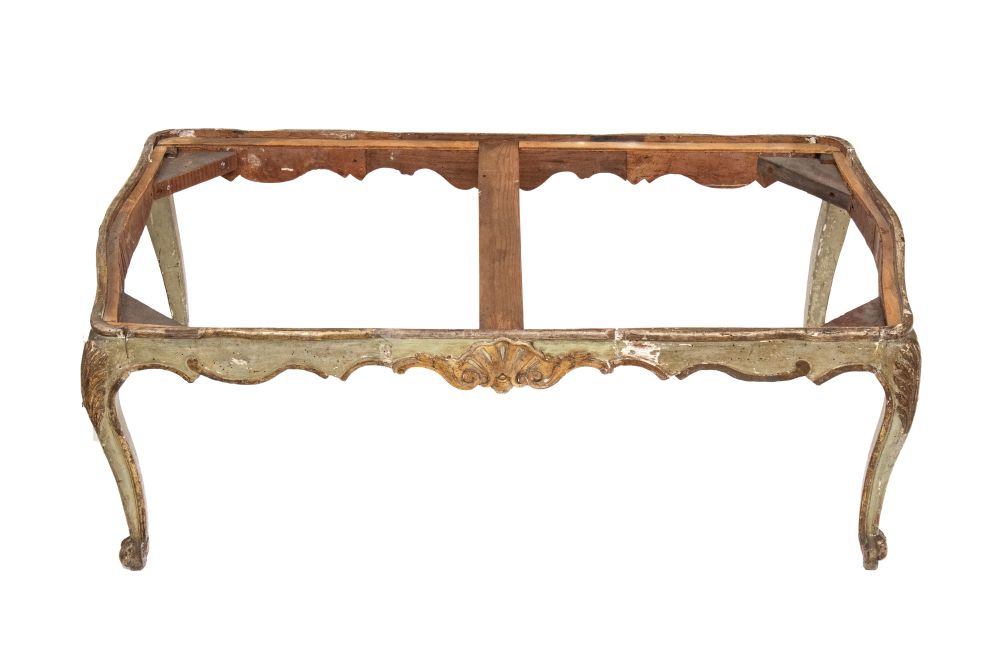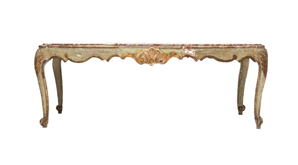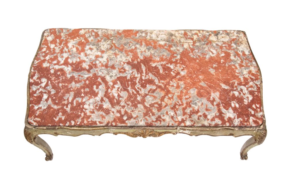 elegante tavolino basso di manifattura veneziana. Struttura in legno intagliato, scolpito e parzialmente dorato, poggiante su gambe mosse terminanti a ricciolo. La fascia sottopiano è sagomata e decorata al centro da un motivo a conchiglia. Piano in marmo rosso di Verona, sagomato e incassato nella struttura lignea.