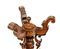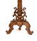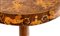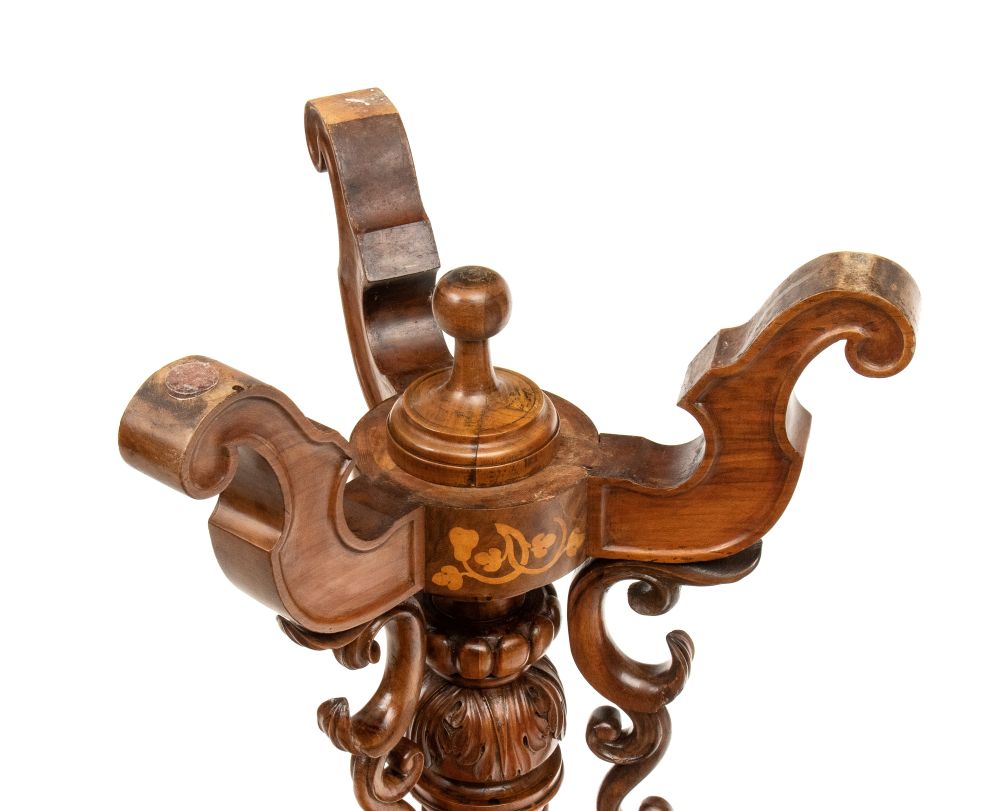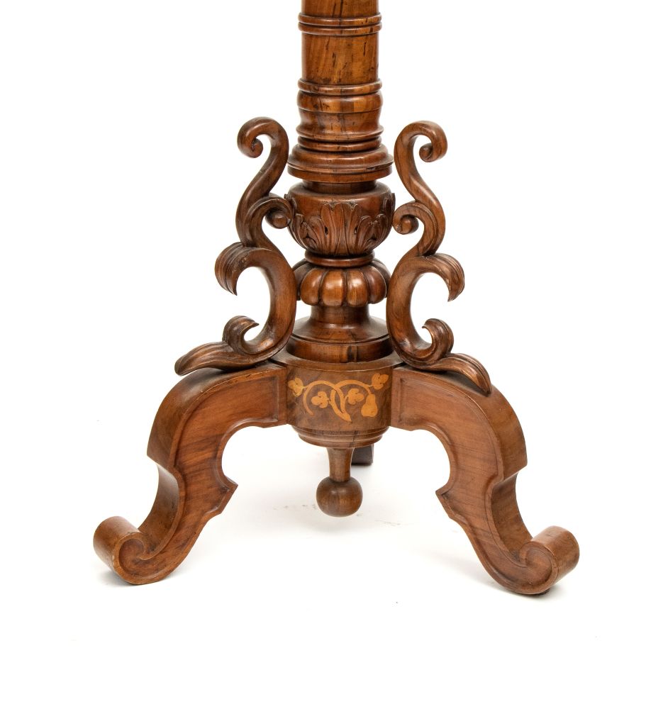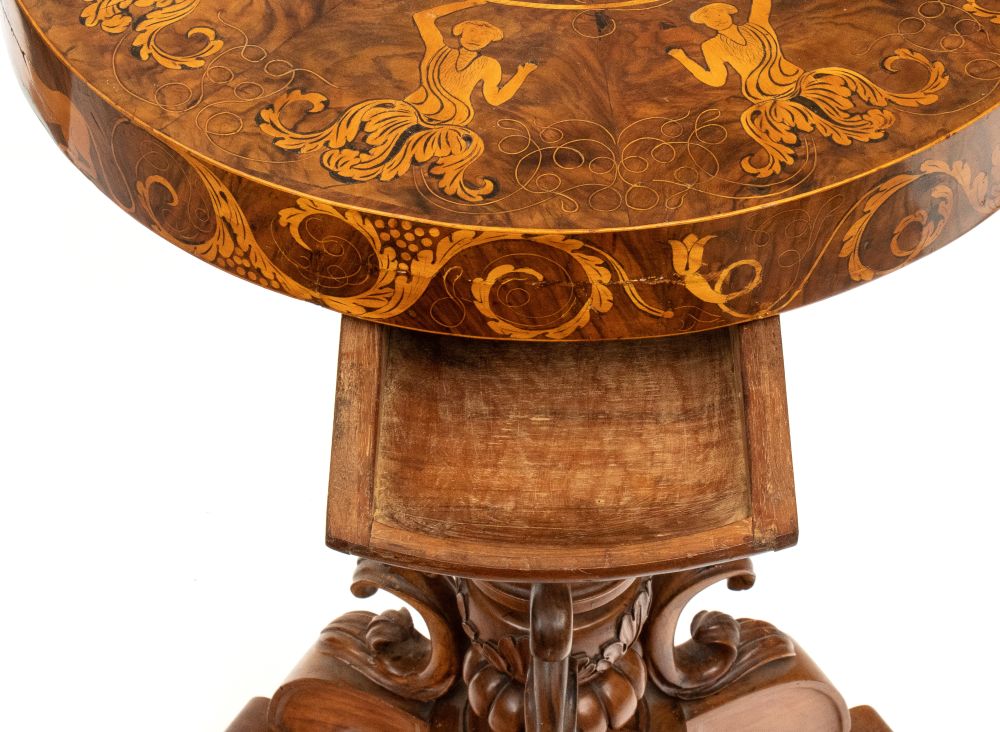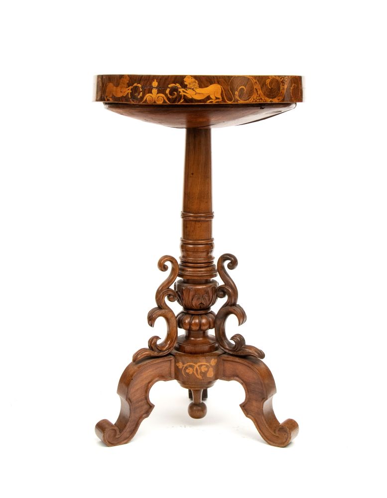 in noce e radica, riccamente intarsiato sul piano e sul bordo con motivi neoclassici, figure mitologiche, animali fantastici e motivi vegetali in legni policromi. Sulla fascia presente un piccolo cassetto. Fusto centrale scolpito con elementi a voluta e tre piedi mossi intagliati.