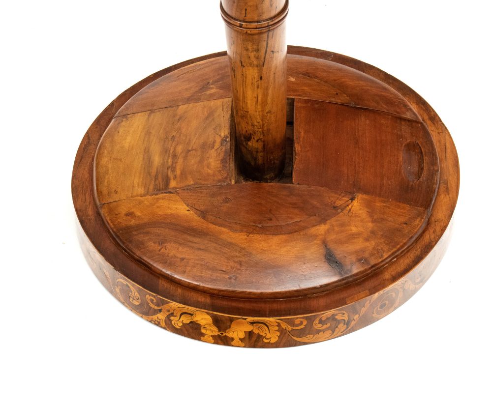 Tavolino tondo intarsiato Emilia, XIX secolo Altezza x diametro: 77,5 x 45 cm.