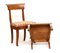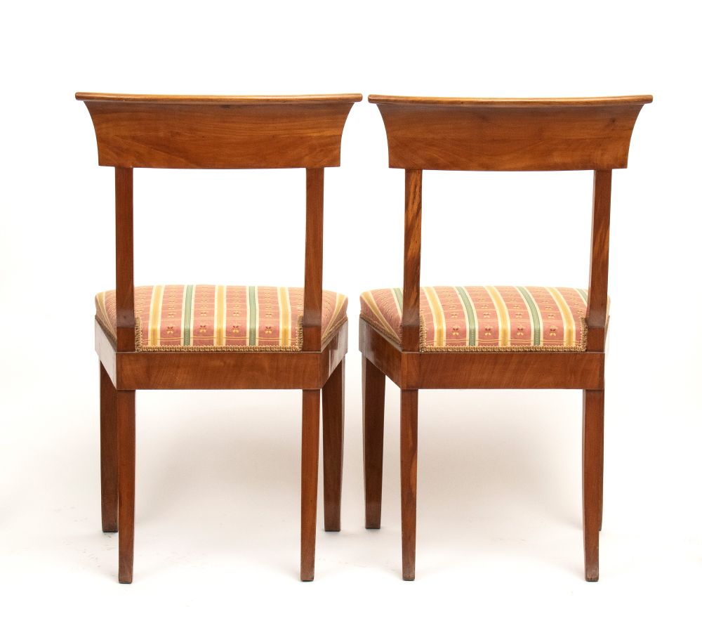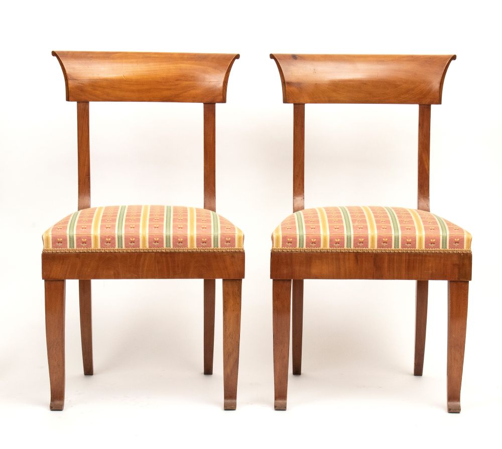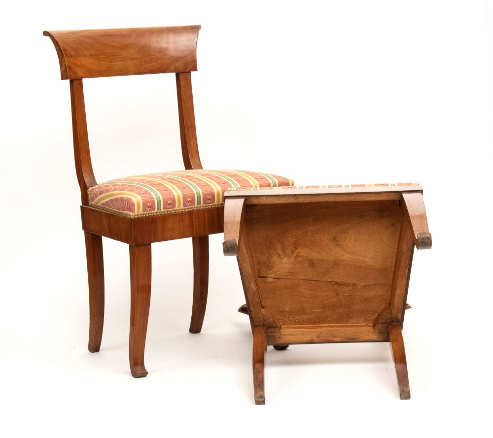 in legno di ciliegio, schienale leggermente ricurvo a cimasa, gambe anteriori dritte e posteriori sciabolate. Seduta imbottita.