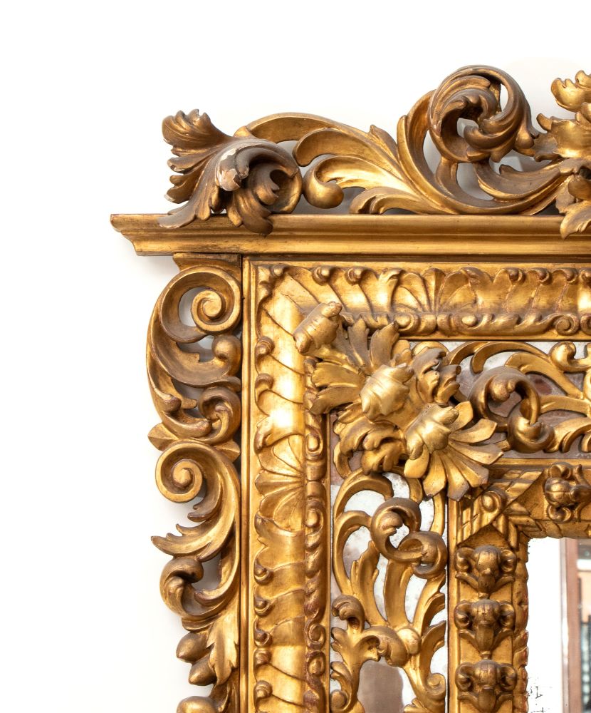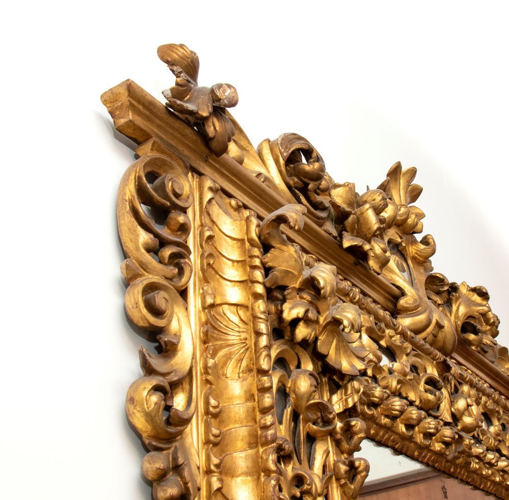 dorata ed lavorata a volute vegetali e fiori, cimasa e cornice impreziositi da specchi, Italia centrale.