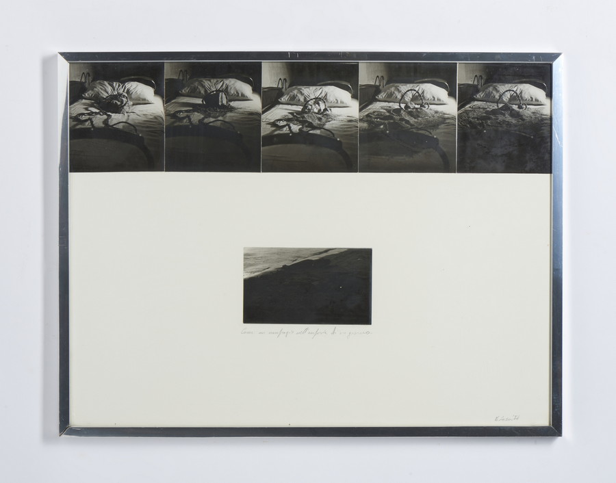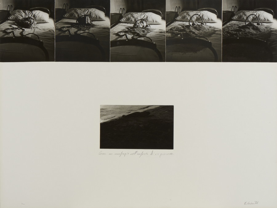 ZAZA MICHELE (n. 1948) NAUFRAGIO EUFORICO. 1974. sei fotografie ai sali d'argento e carta politenata su pannello di cartone. Cm 67,50 x 51,00. firma e data