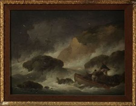 MORLAND GEORGE Londra 1763-1804 Marina con scena di naufragio 1795/1800 Olio su tela 27x36 cm Firmato in basso a sinistra con la sigla:"GM FECIT" Autentica della Galleria Caretto, Torino su fotografia Ottimo stato di conservazione Oil on canvas Signed lower left with the sign: "GM FECIT"