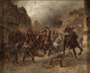BEAUQUESNE WILLIAM CONSTANT 1847-1913 Battaglia Olio su tela cm 46,5x55 Firma in basso a destra Oil on canvas