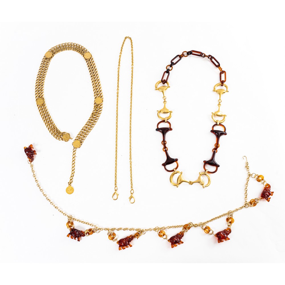 Quattro fibbie: una con catena a maglia in metallo dorato e decorata con monete; una catena in metallo dorato; una con catena dorata ed elefanti in lucite finta tartaruga; una con catena in metallo dorato, imboccature equestri in metallo dorato.
