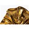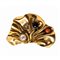 Spilla con montatura in metallo dorato di forma informe arricciata, cabochon nero e rosso, cristallo incolore. Marchio di produzione.