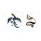 Spilla con figura di pappagallo con montatura in metallo dorato, smalti blu e verdi. Marchio di produzione. Spilla con figura di pesce, montatura in metallo dorato, smalti neri, diamanti sintetici taglio brillante, pietra colore verde. Marchio di produzione.