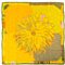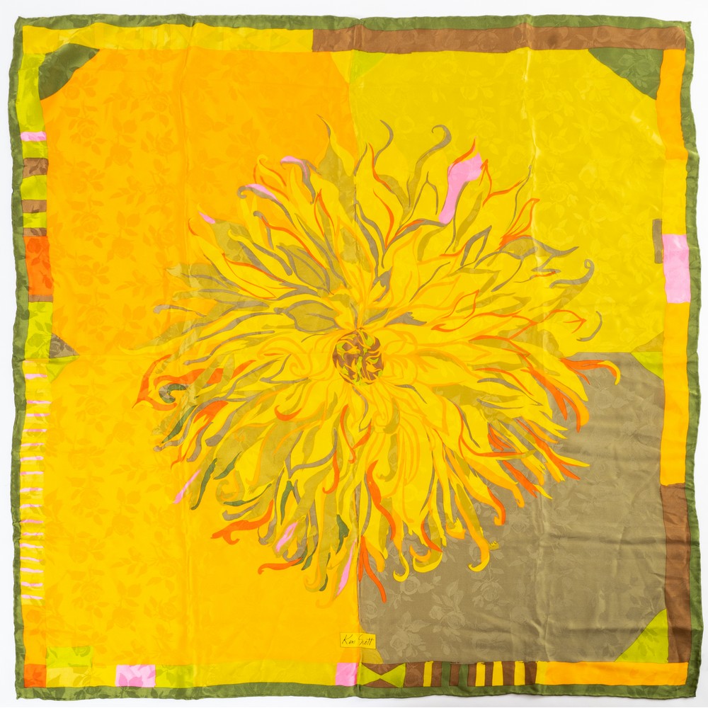 Foulard in seta a campo giallo, arancione e verde, decorato con grande fiore centrale, bordo verde. Marchio di produzione.