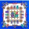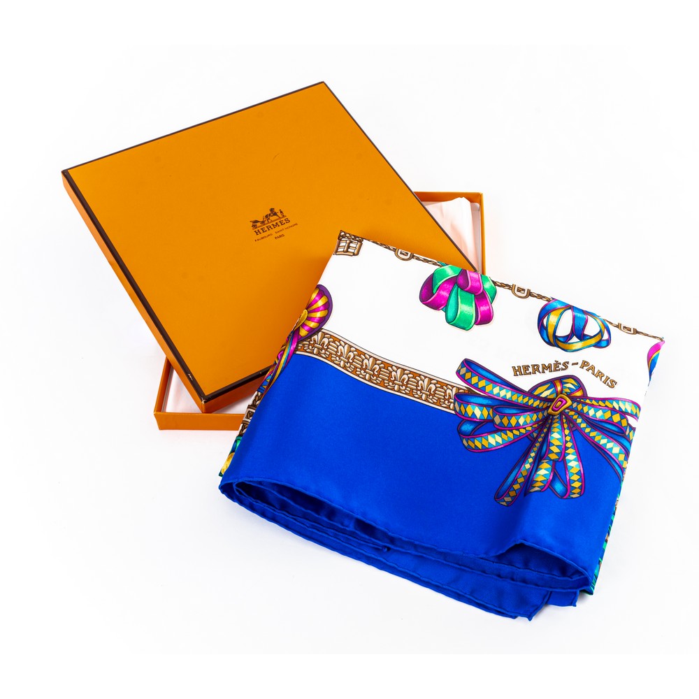 Foulard in seta "Le rubans du cheval" disegnato da Joachim Metz, coccarde equestri colorate su fondo bianco, cornice blu elettrico, mai indossato. Marchio di produzione.
