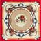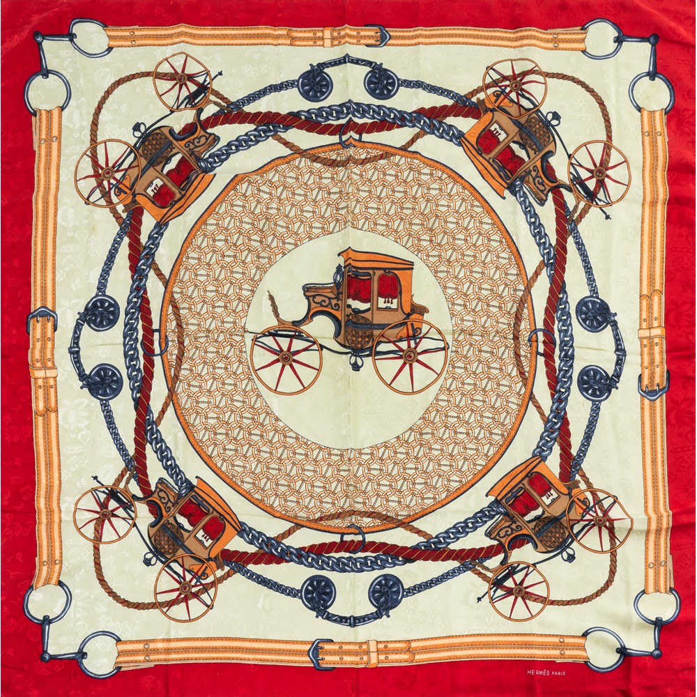 Foulard in seta con disegno di carrozze su fondo avorio, decori di catene blu, bordo rosso. Lievi difetti. Marchio di produzione.