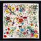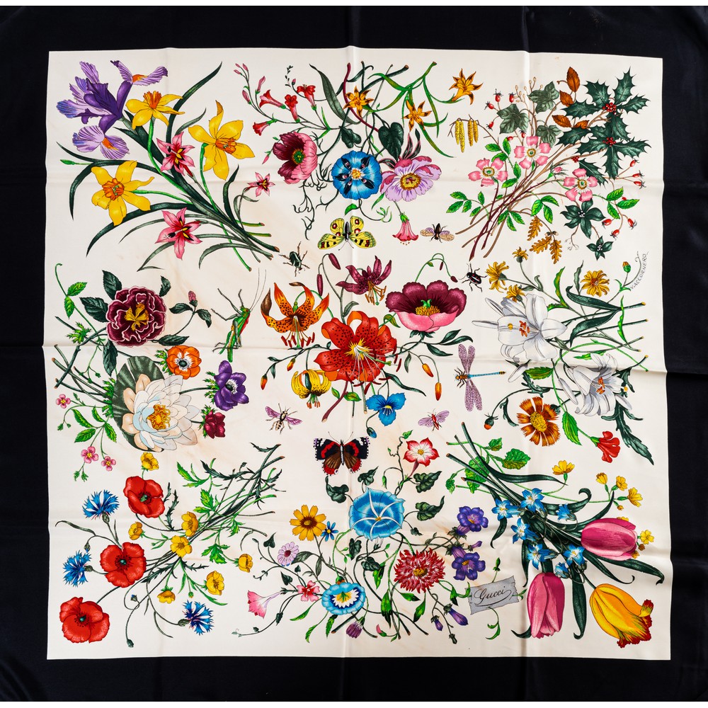 Foulard in seta "Flora", campo bianco bordato di nero, decori con mazzo di fiori in policromia. Marchio di produzione sul fronte. Macchie.