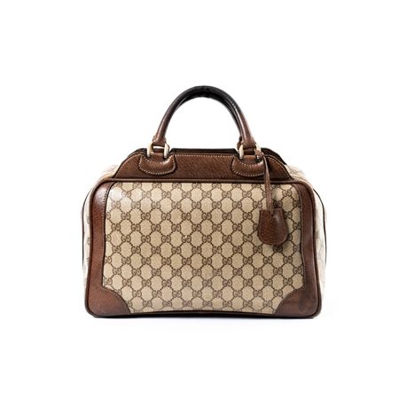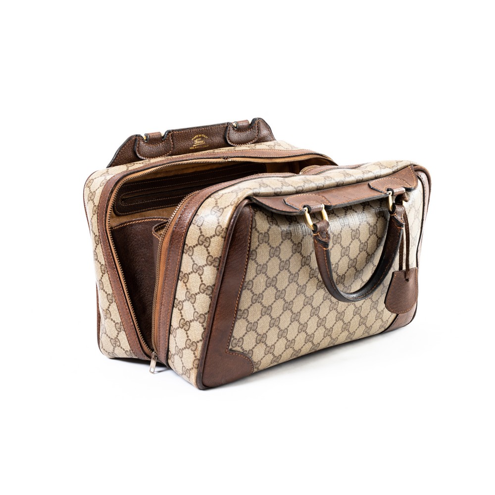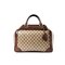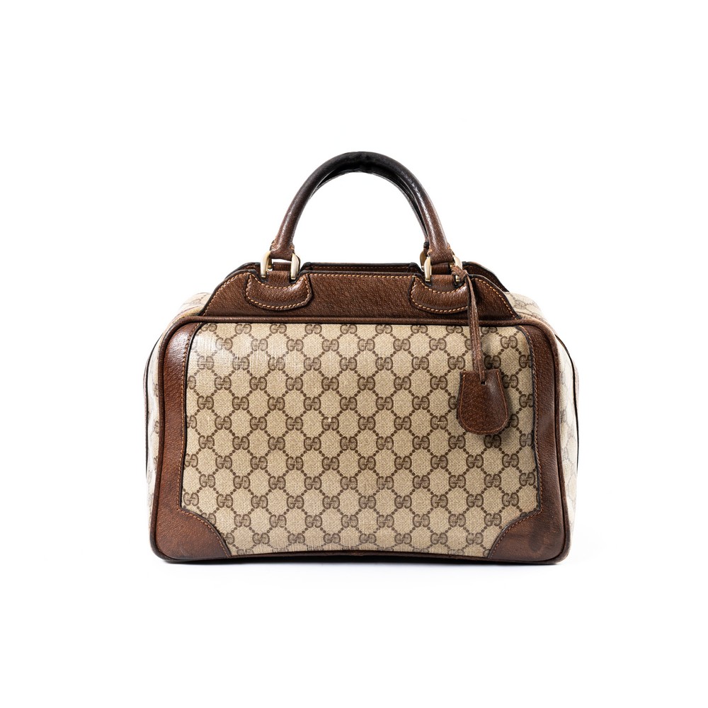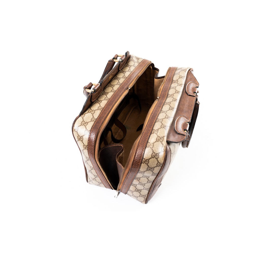 Borsa a mano/beauty da viaggio con tela Monogram e pelle di cinghiale marrone, manici tubolari, minuterie in metallo dorato. Usure. Marchio di produzione.