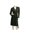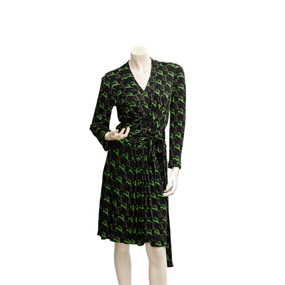 Abito lungo in viscosa nera con stampa a motivo di cervi nei toni del verde, maniche lunghe, collo a V, incrocio sul davanti, cintura. Etichetta di produzione. Taglia S.
