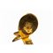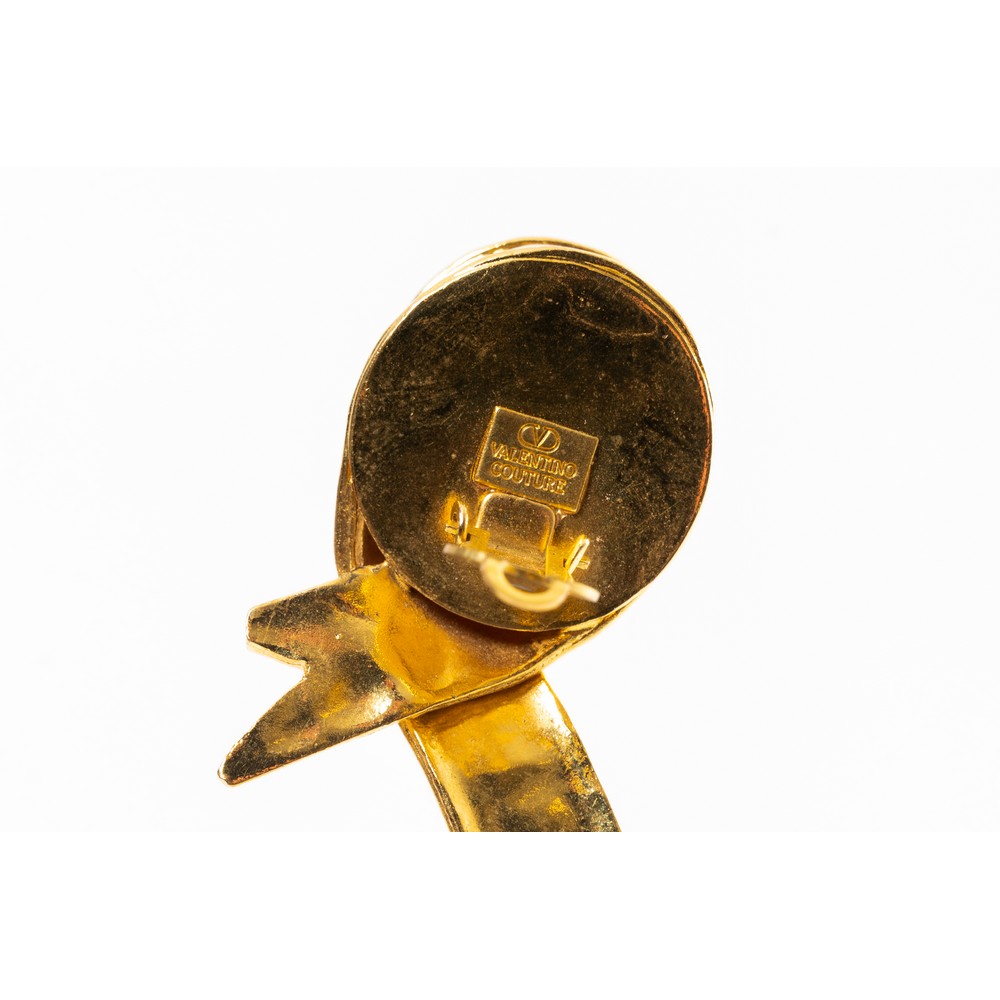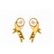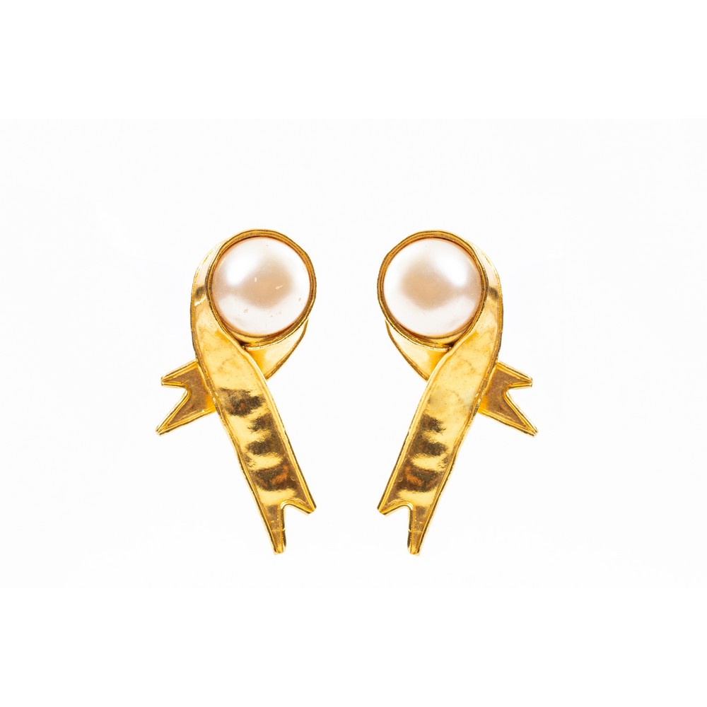 Orecchini con montatura a nastro in metallo dorato, mezza perla, chiusura a clips. Lievi usure. Marchio di produzione.