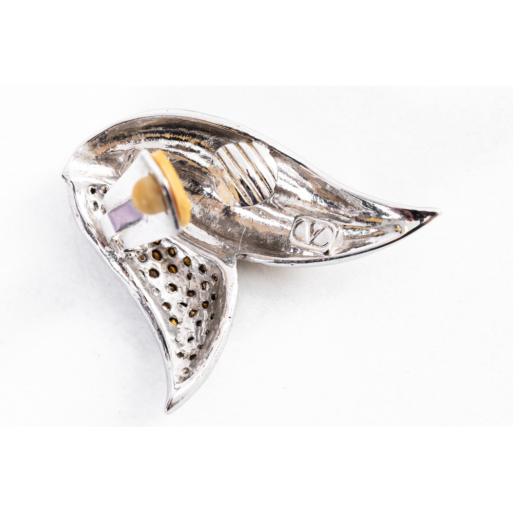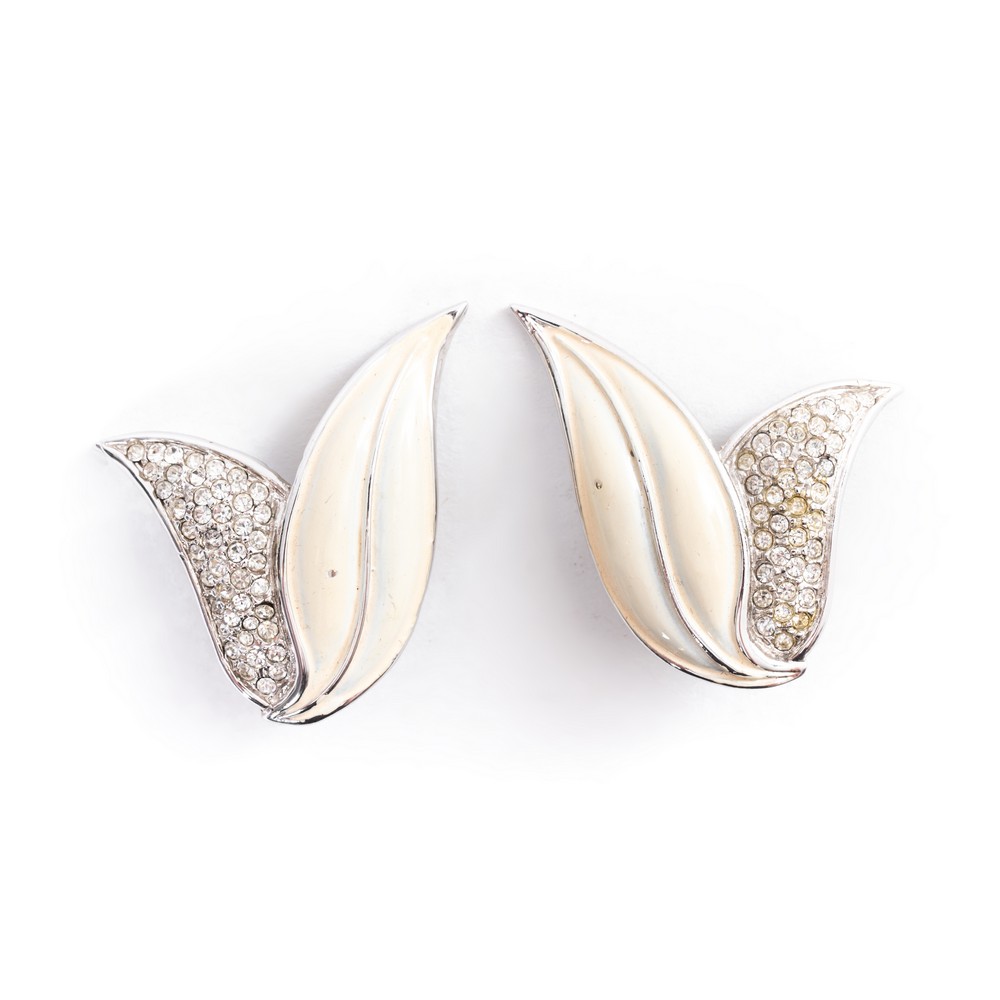 Orecchini con montatura in metallo argentato, due foglie, una ricoperta da pavè di diamanti sintetici ed una con smalto avorio. Marchio di produzione.