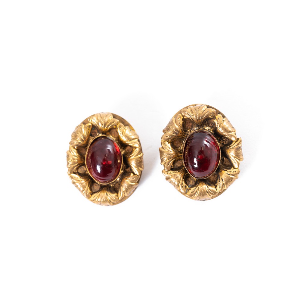 Orecchini con montatura in metallo dorato e lavorato a foglie di acanto curvate, centrale ovale in gripoix rubino, chiusura a clips. Marchio di produzione.