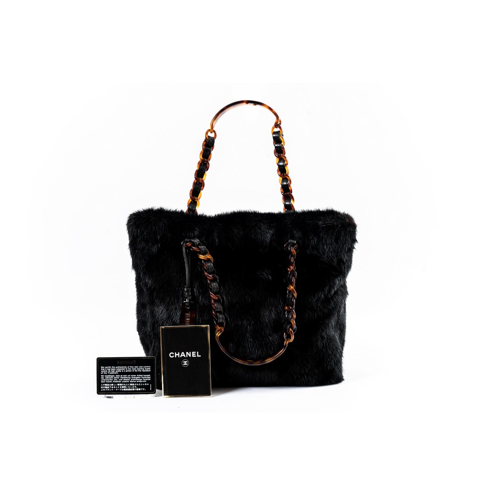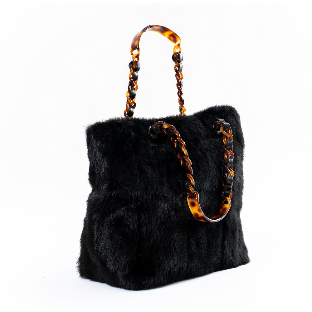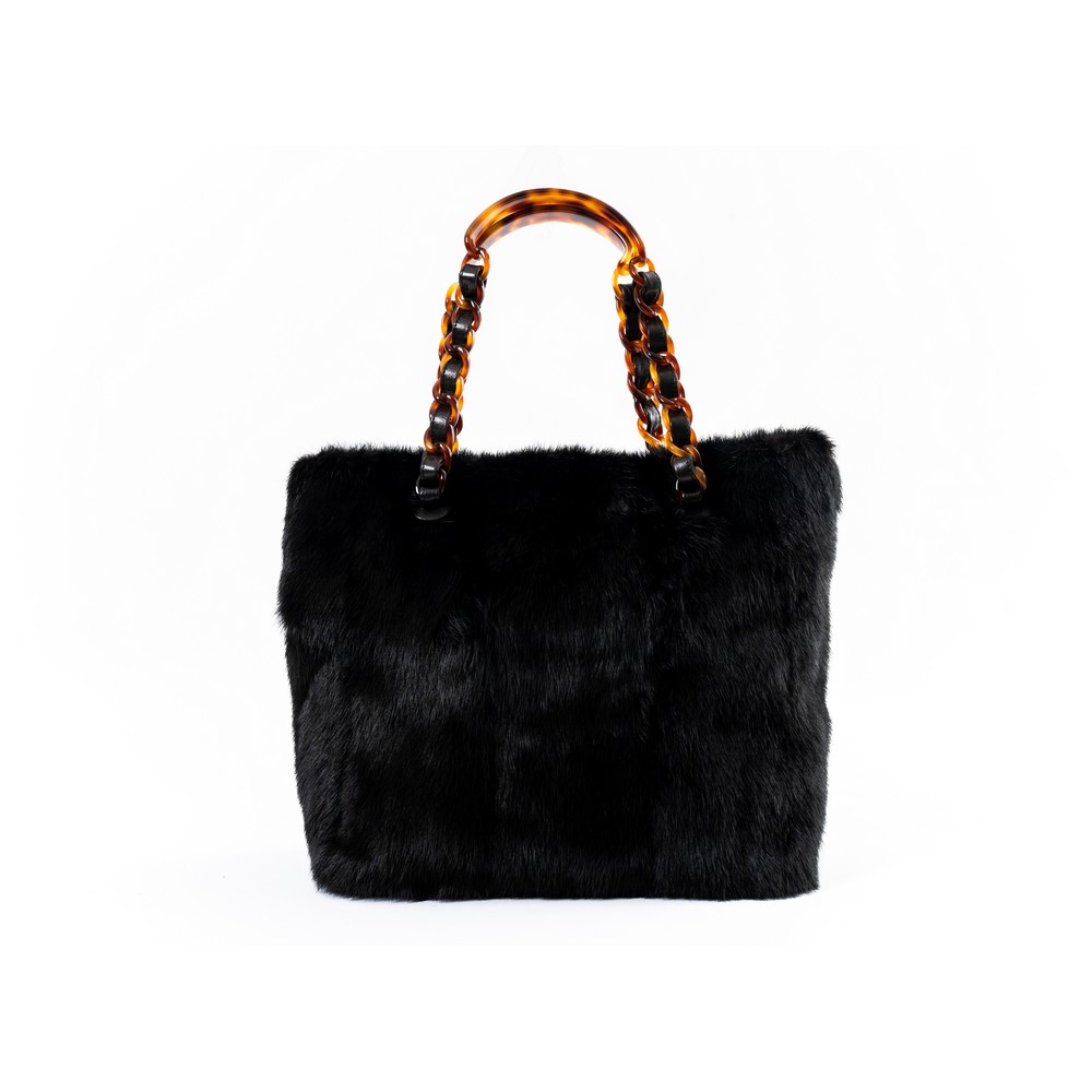 Borsa a mano modello “Shopper” in pelliccia di visone, manici in lucite ad effetto tartaruga, interno in pelle nera, tasca interna. Codice, card, marchio di produzione.