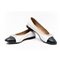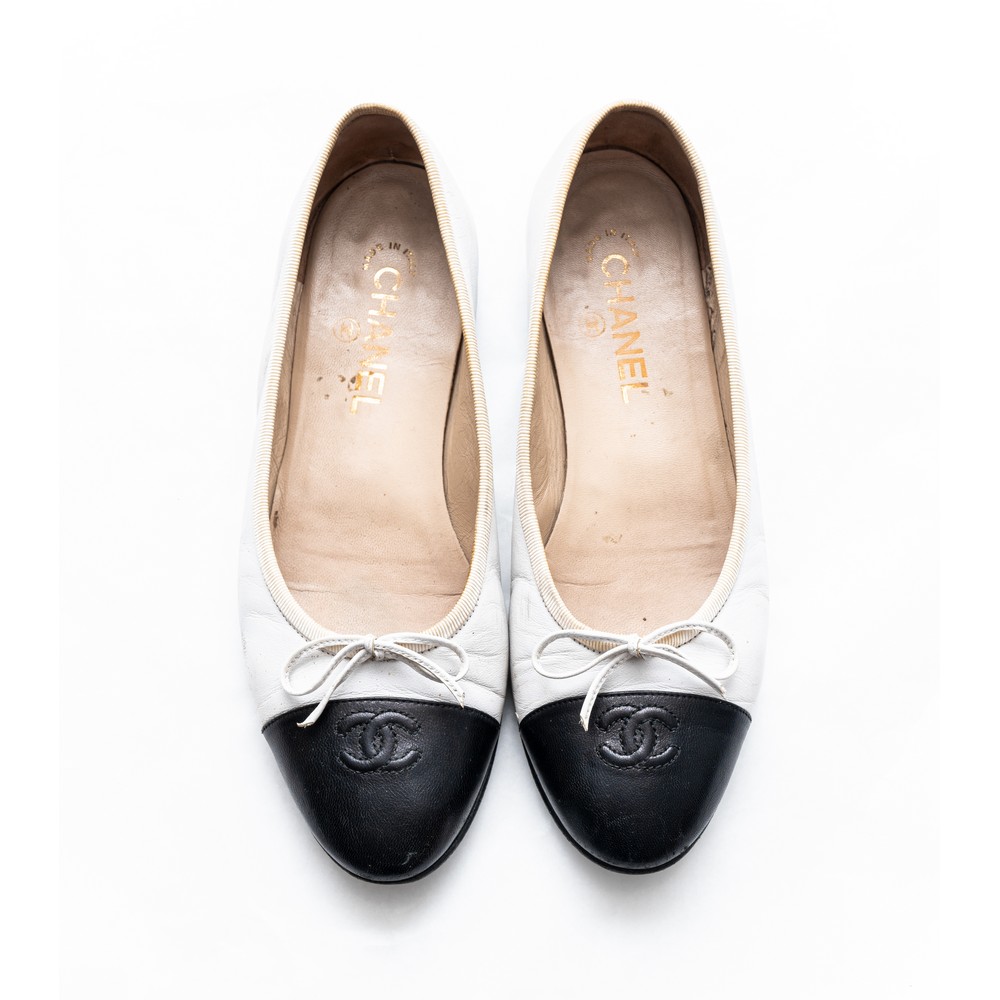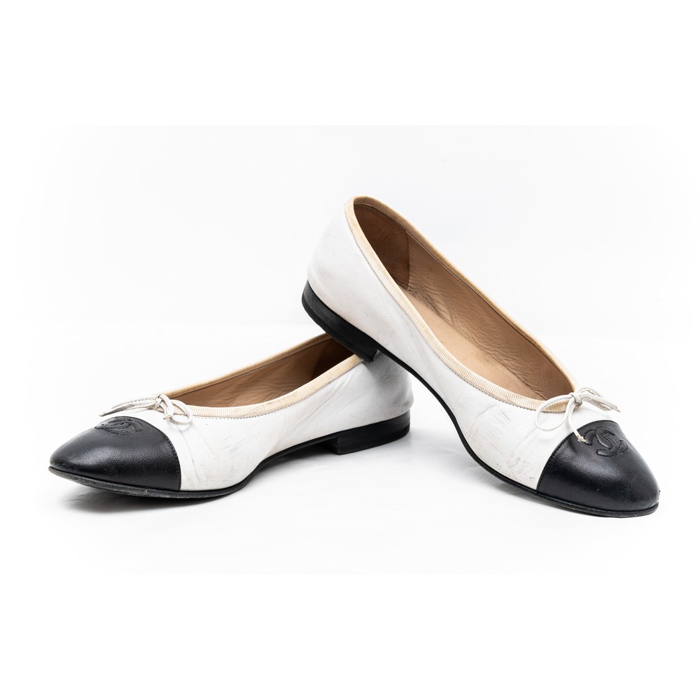 Un paio di calzature modello ”Ballerines” in pelle bianca e nera, logo imbottito sulla punta, fiocco. Lievi segni di uso. Taglia 39. Scatola originale. Lievi difetti.