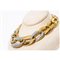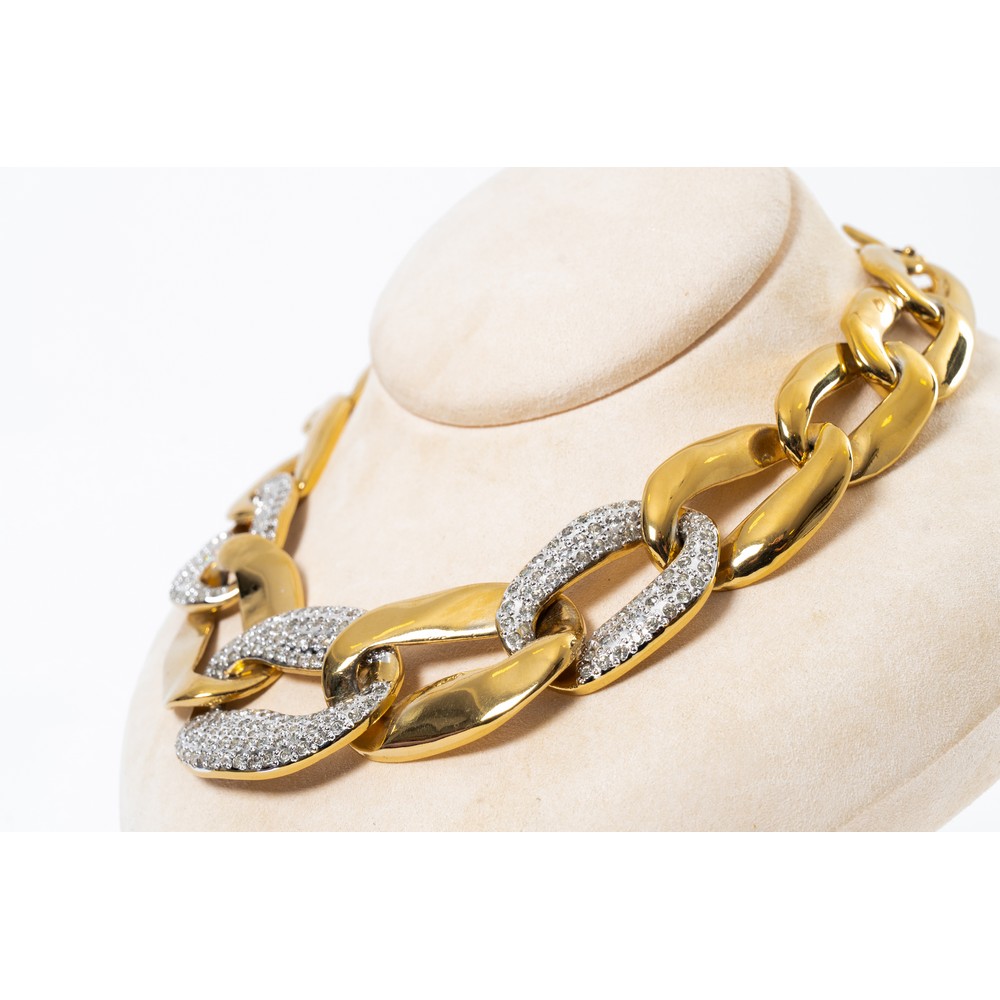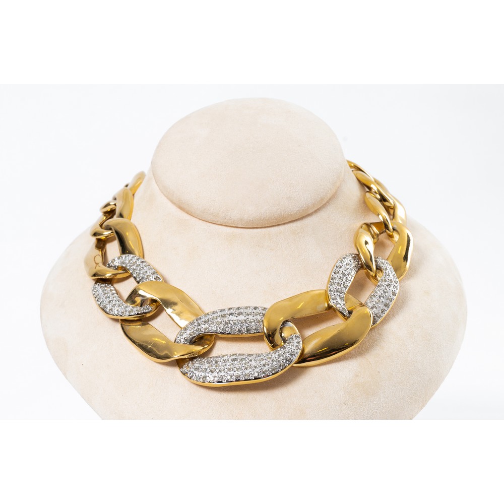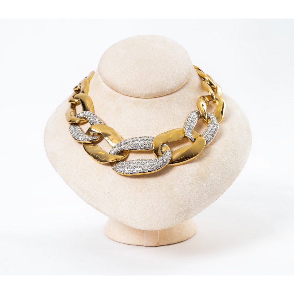 Collana girocollo con montatura in metallo dorato, maglie a catena piatta lucide alternate a maglie con pavé di diamanti sintetici taglio brillante, chiusura a moschettone con logo pendente. Scatola originale. Marchio di produzione.
