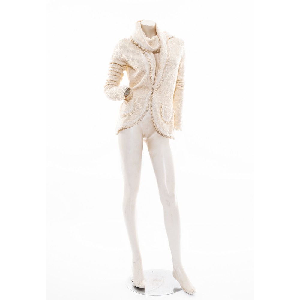 Giacca in lana bouclè avorio, collo sciallato con sciarpa da un lato, due tasche arrotondate, chiusura frontale con ganci, passamaneria avorio. Taglia 40. Macchie. Marchio di produzione.