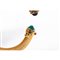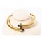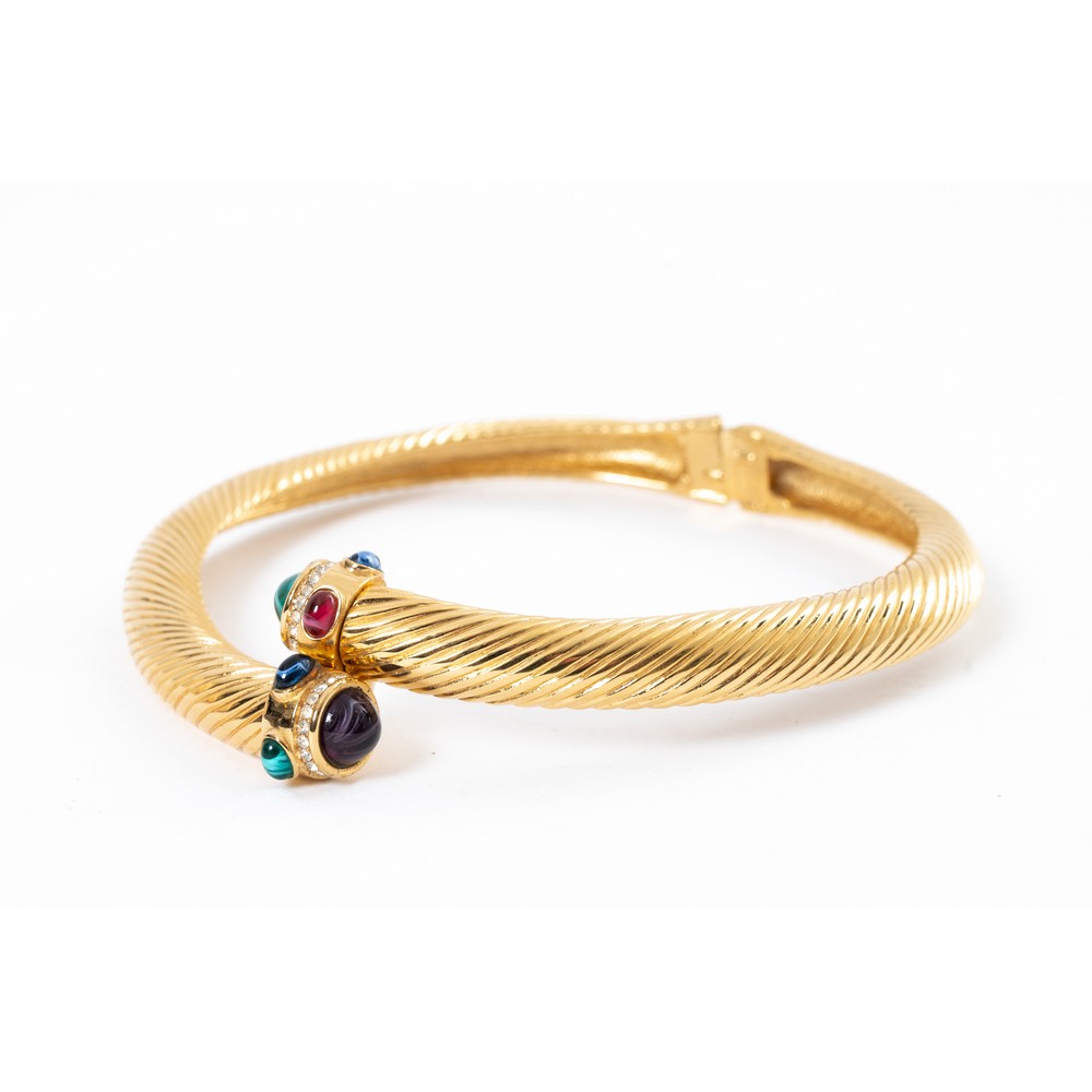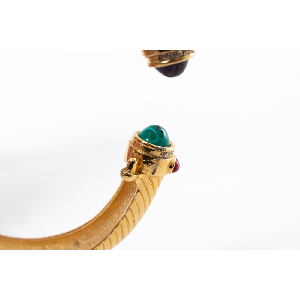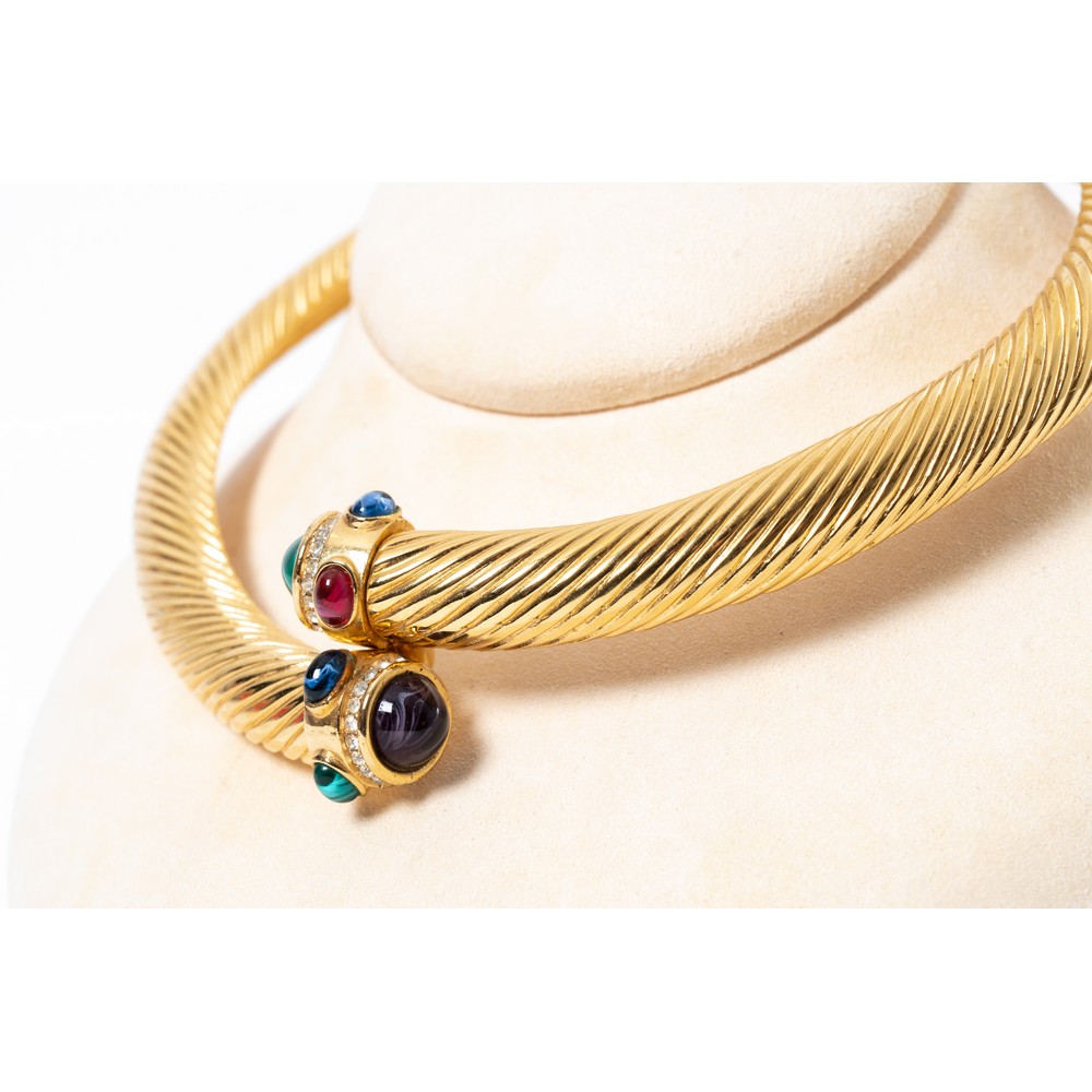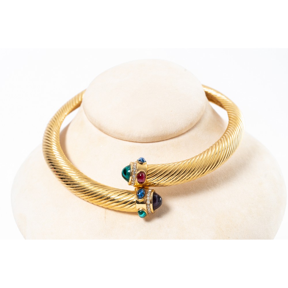 Girocollo rigido con montatura in metallo dorato e lavorato a torchon, al centro due contrarie con cabochon di smeraldi, zaffiri, rubini e diamanti sintetici. Marchio di produzione.