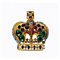 Spilla a corona con montatura in metallo dorato, gemme sintetiche di colore e taglio differente. Marchio di produzione.