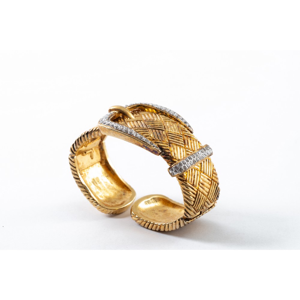 Bracciale con montatura in metallo dorato con lavorazione a quadrati scannelati, fibbia in diamanti sintetici, chiusura a molla.