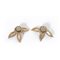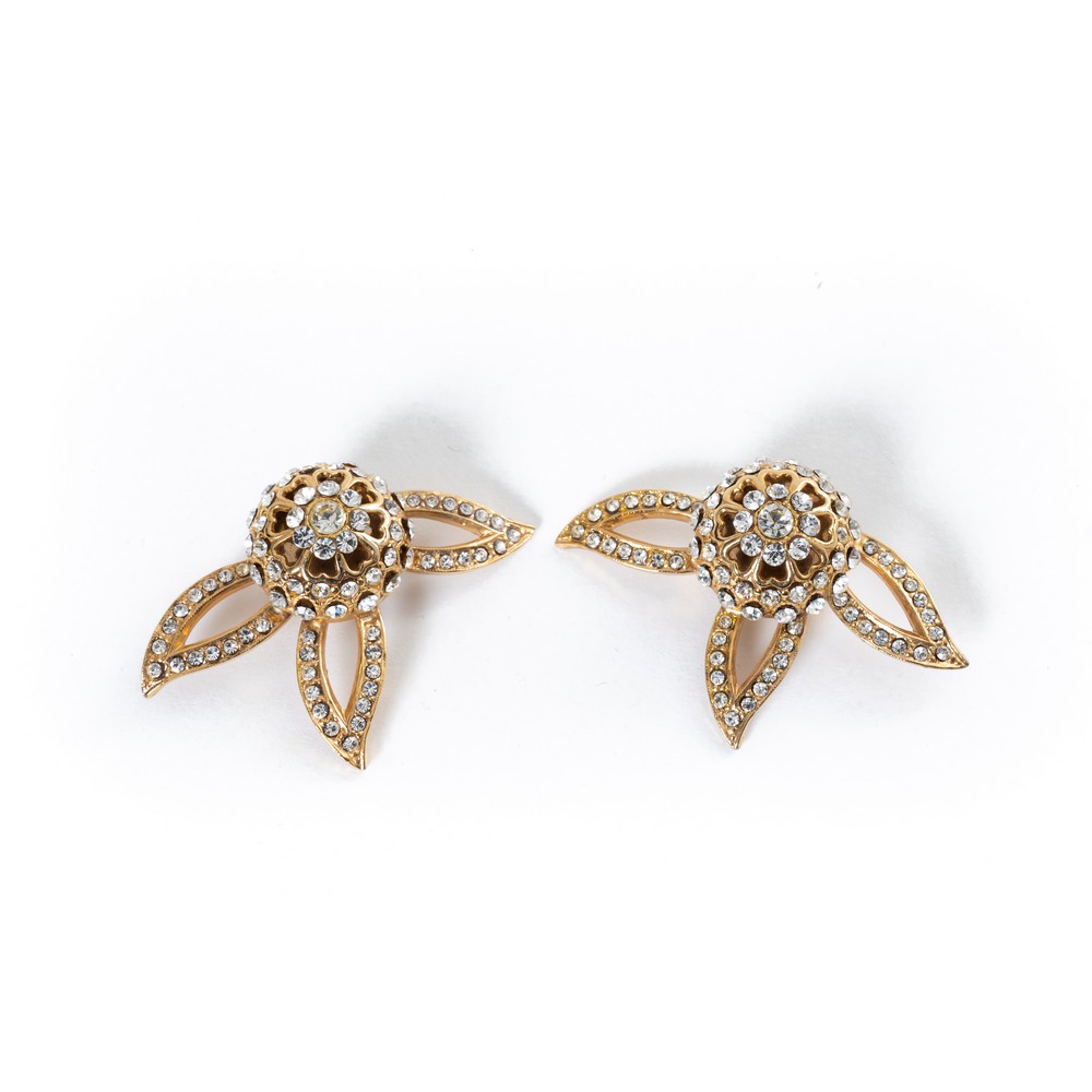 Orecchini a fiore con montatura in metallo dorato con lavorazione a petali in diamanti sintetici, semisfera centrale con trafori e diamanti sintetici, chiusura a clips. Marchio di produzione.