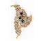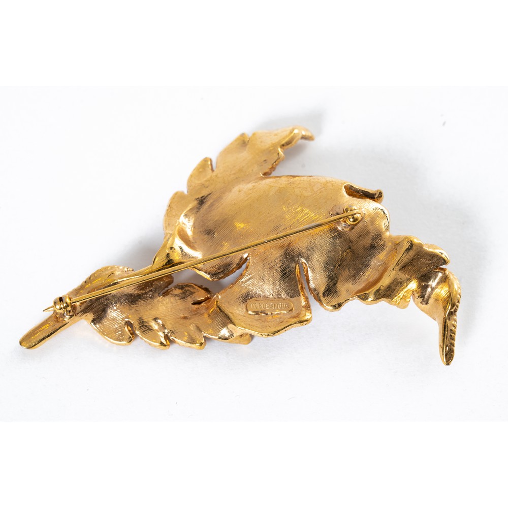 Grande spilla a fiore con montatura in metallo dorato interamente ricoperta da diamanti sintetici, pistilli con pietre sintetiche rubino, smeraldo e zaffiro di taglio ovale. Marchio di produzione.