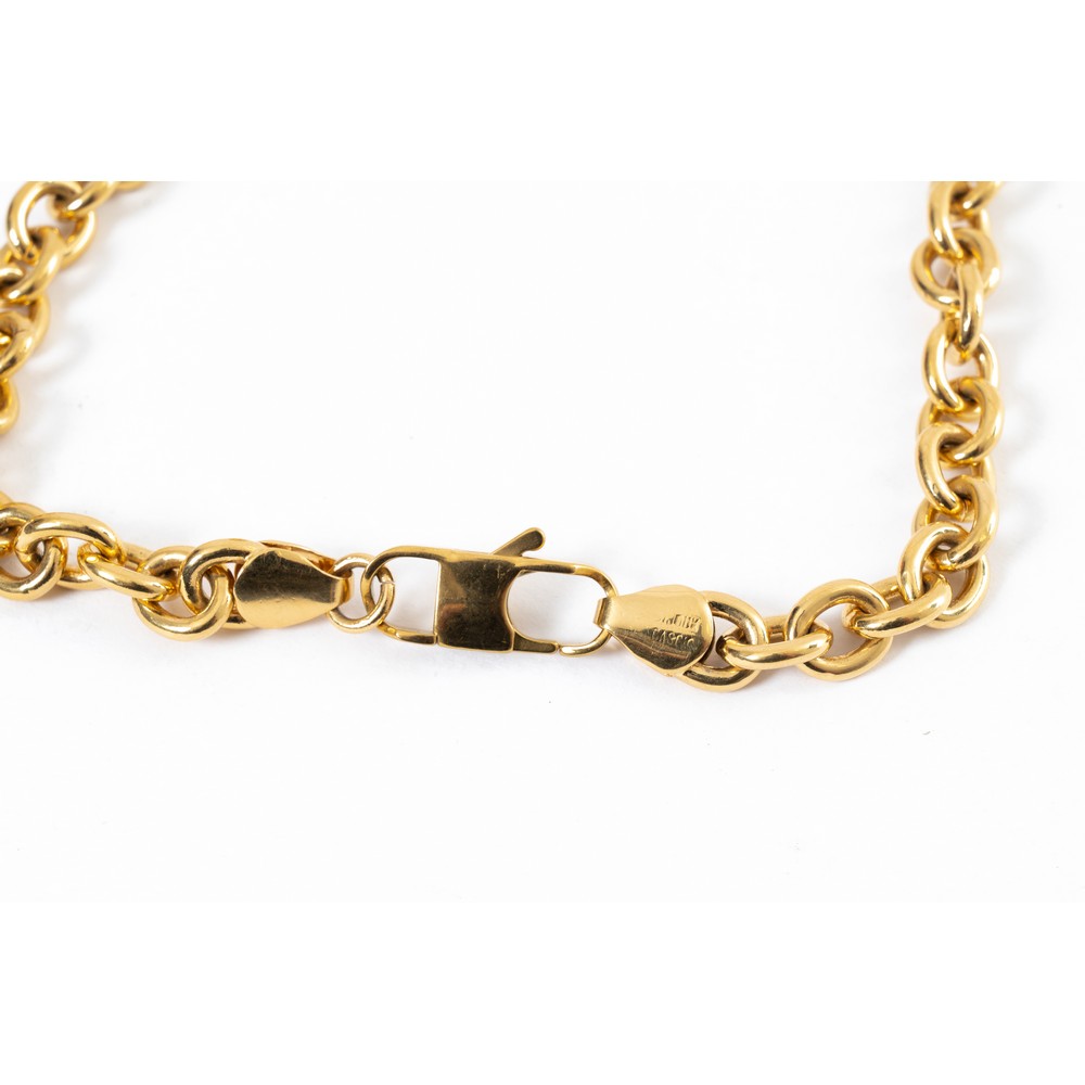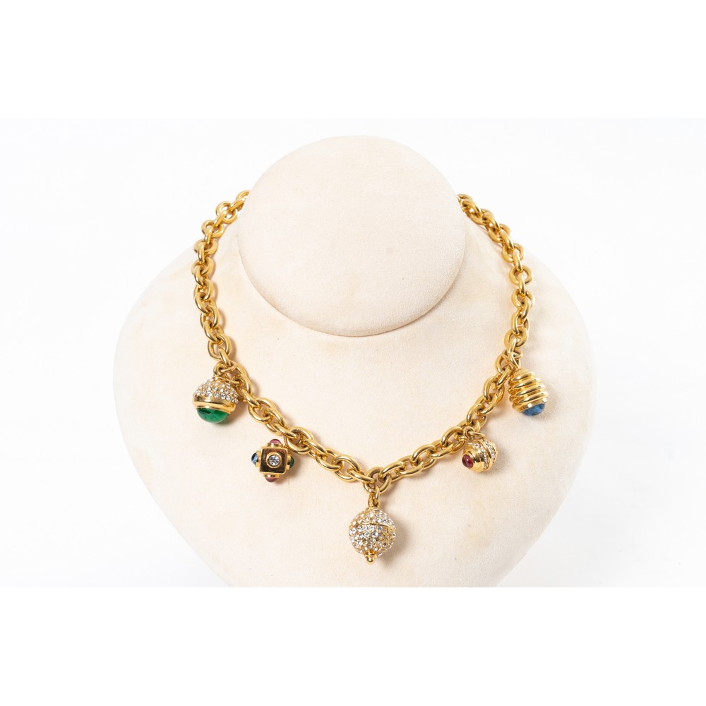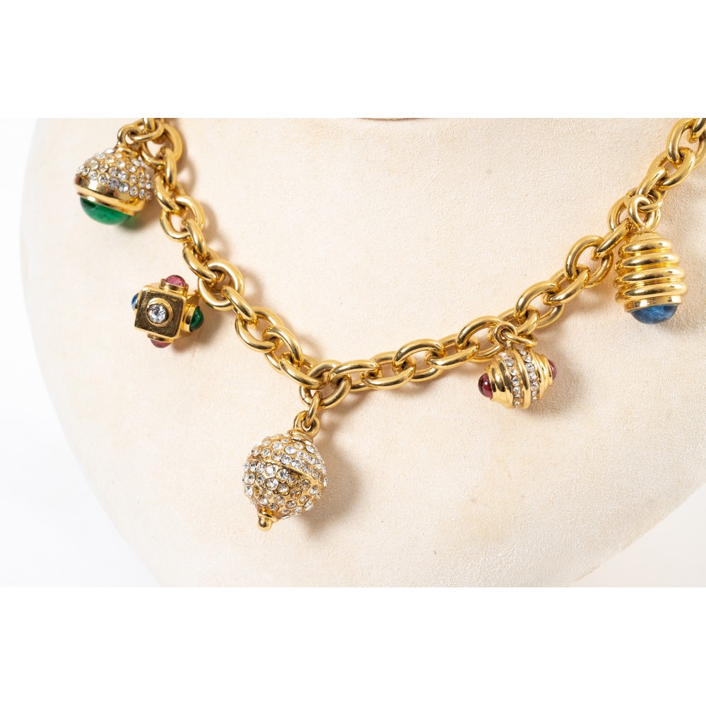 Collana con maglie ad anelli in metallo dorato, pendenti in metallo dorato con perle pavè di diamanti sintetici, rubini, smeraldi e zaffiri sintetici, chiusura a moschettone, moneta con marchio di produzione.