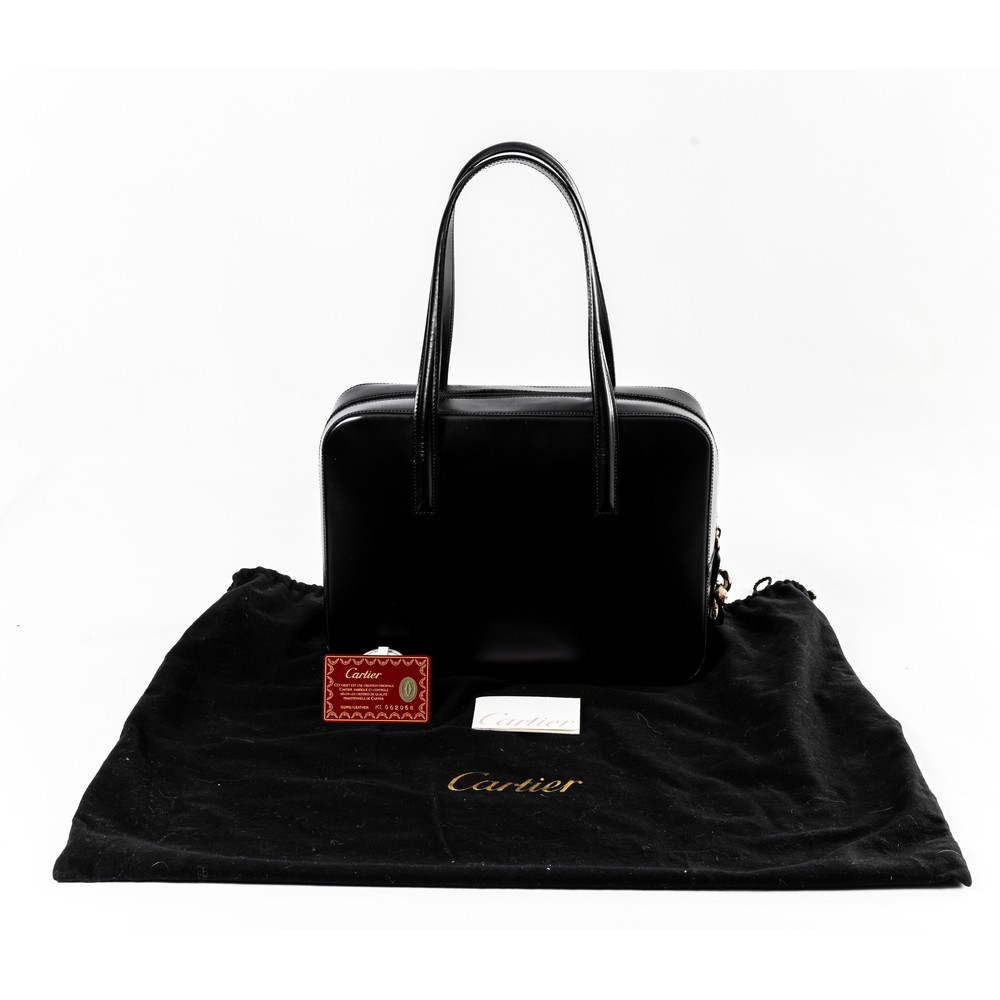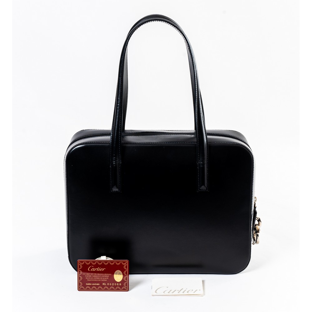 Borsa a mano della serie “Panthère” in pelle di vitello spazzolata nera, chiusura con cerniere sulla parte superiore con cursore e chiusura gioiello in metallo cromato, manici con imbottitura, tasca interna. Dust Bag e card identificativa. Lievi graffi. Marchio di produzione.