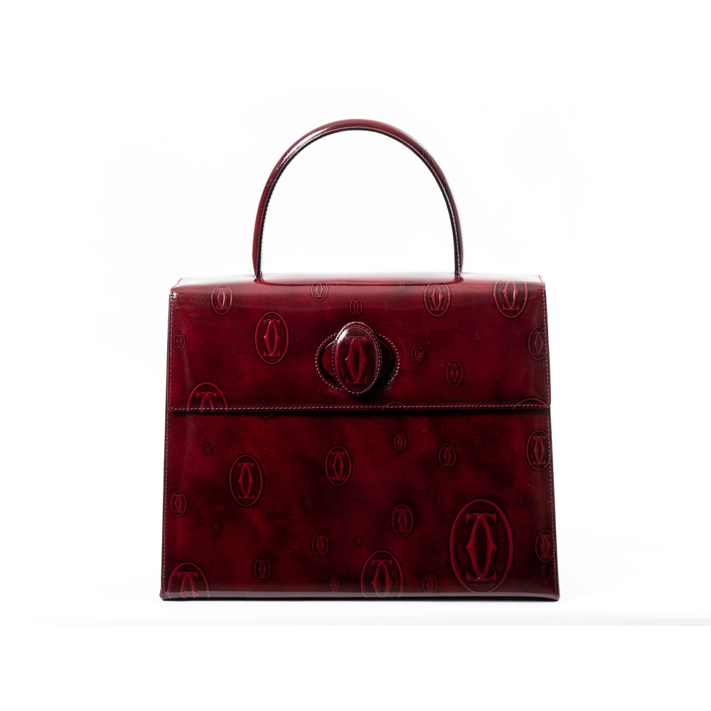 Borsa a mano modello ”Happy Birthday” in vernice Borgogna con loghi Cartier, manico lievemente imbottito, patta frontale con chiusura a torsione, tasche interne con zip e slip. Marchio di produzione.