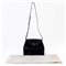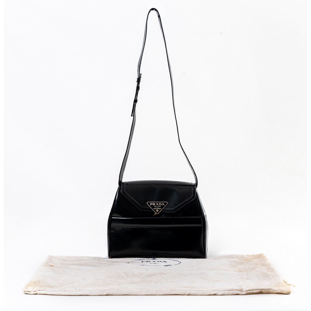 Borsa a spalla in vitello spazzolato nero, chiusura frontale a pressione, logo triangolare, tasca frontale e tasca interna, fodera logata. tracolla piatta regolabile. segni di uso, angoli con usure. Dust Bag. Marchio di produzione.