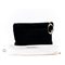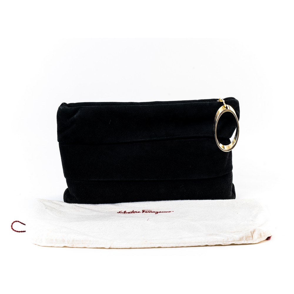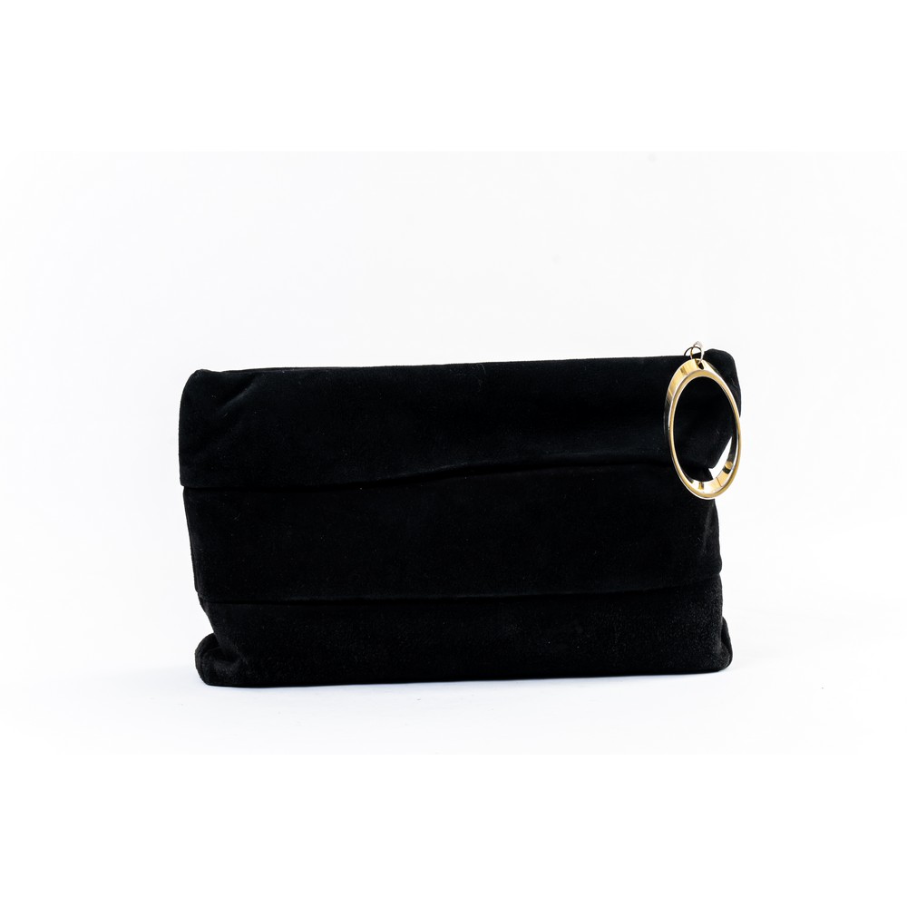 Borsa a mano modello busta in pelle scamosciata nera con tre fasce frontali, chiusura con zip superiore con cursore gioiello in metallo dorato, tasca interna. Dust bag. Segni di uso. Marchio di produzione e codice numerico.