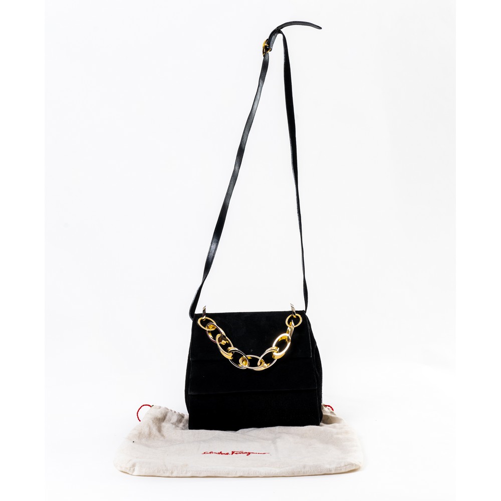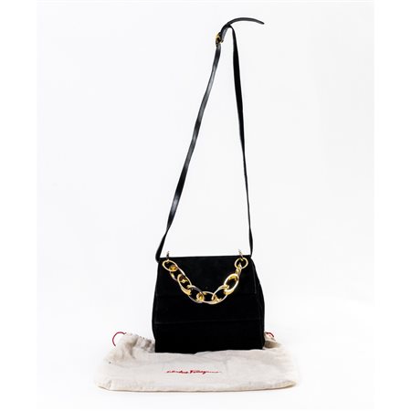 Borsa a mano e a spalla in pelle scamosciata nera con tre fasce frontali, chiusura frontale a pressione, catena gioiello con maglie ovalizzate in metallo dorato, tasca interna. Dust bag. Segni di uso. Marchio di produzione e codice numerico.