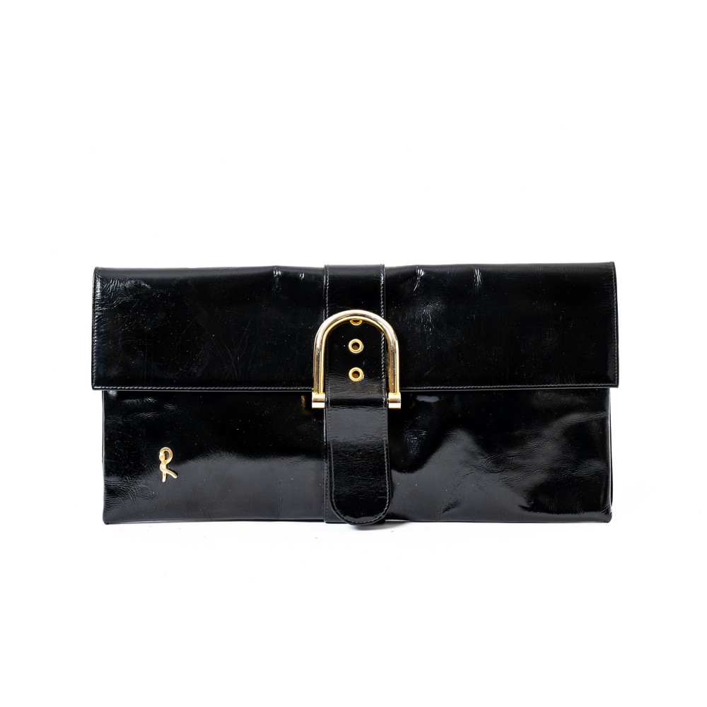Borsa a busta in pelle verniciata nera, tasca interna, apertura sul fronte, chiusura con fibbia in metallo, monogramma “R” in metallo dorato laterale. Segni di uso e restauri. Marchio di produzione.