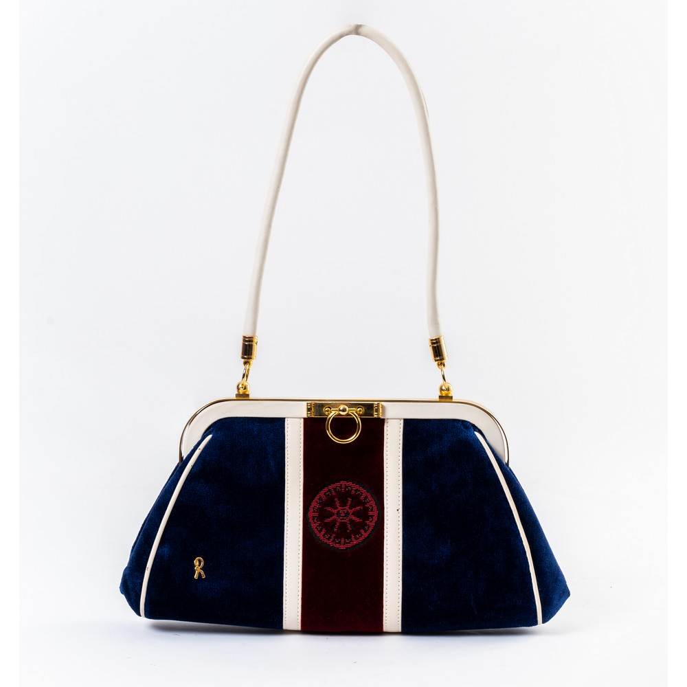 Borsa a mano modello “Doctor Bag” in velluto blu e bordeaux con finiture in pelle bianca, chiusura e profilo superiore sagomato in metallo dorato, “R” sul fronte inferiore, manico piatto, due tasche. Marchio di produzione.
