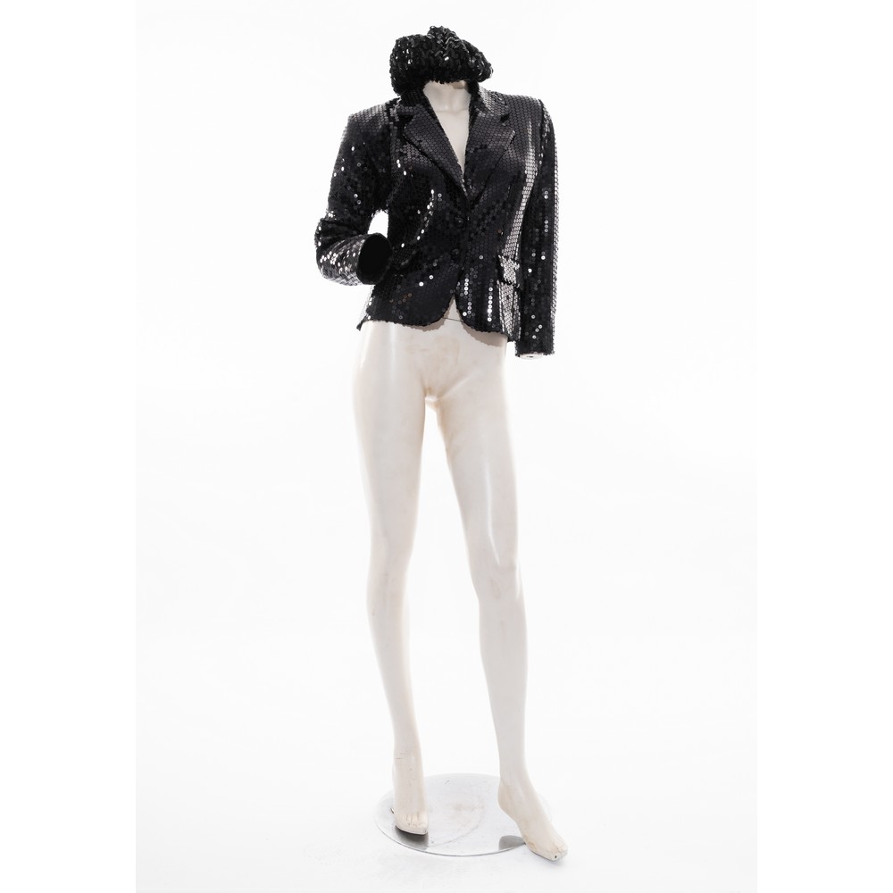 Blazer interamente rivestito da paillettes nere, collo classico, chiusura frontale con due bottoni, due tasche, corredato di basco in paillettes. Taglia S. Marchio di produzione.