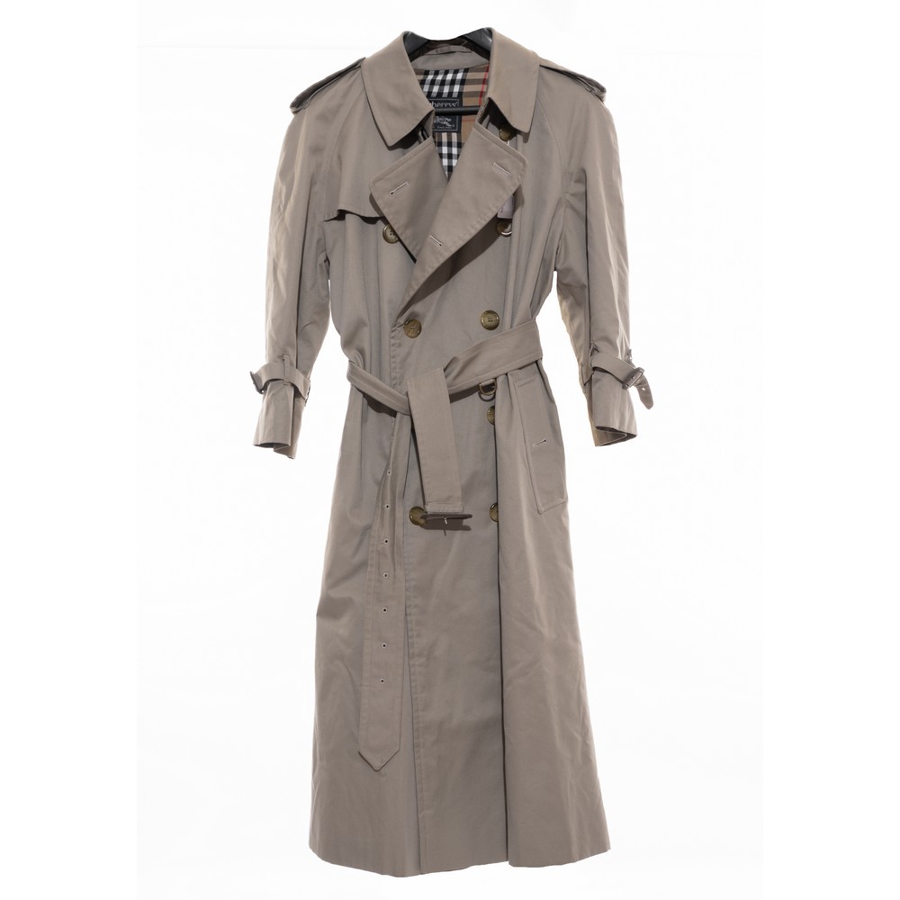 Impermeabile in tele beige, abbottonatura frontale, cintura. Taglia 54. Marchio di produzione.